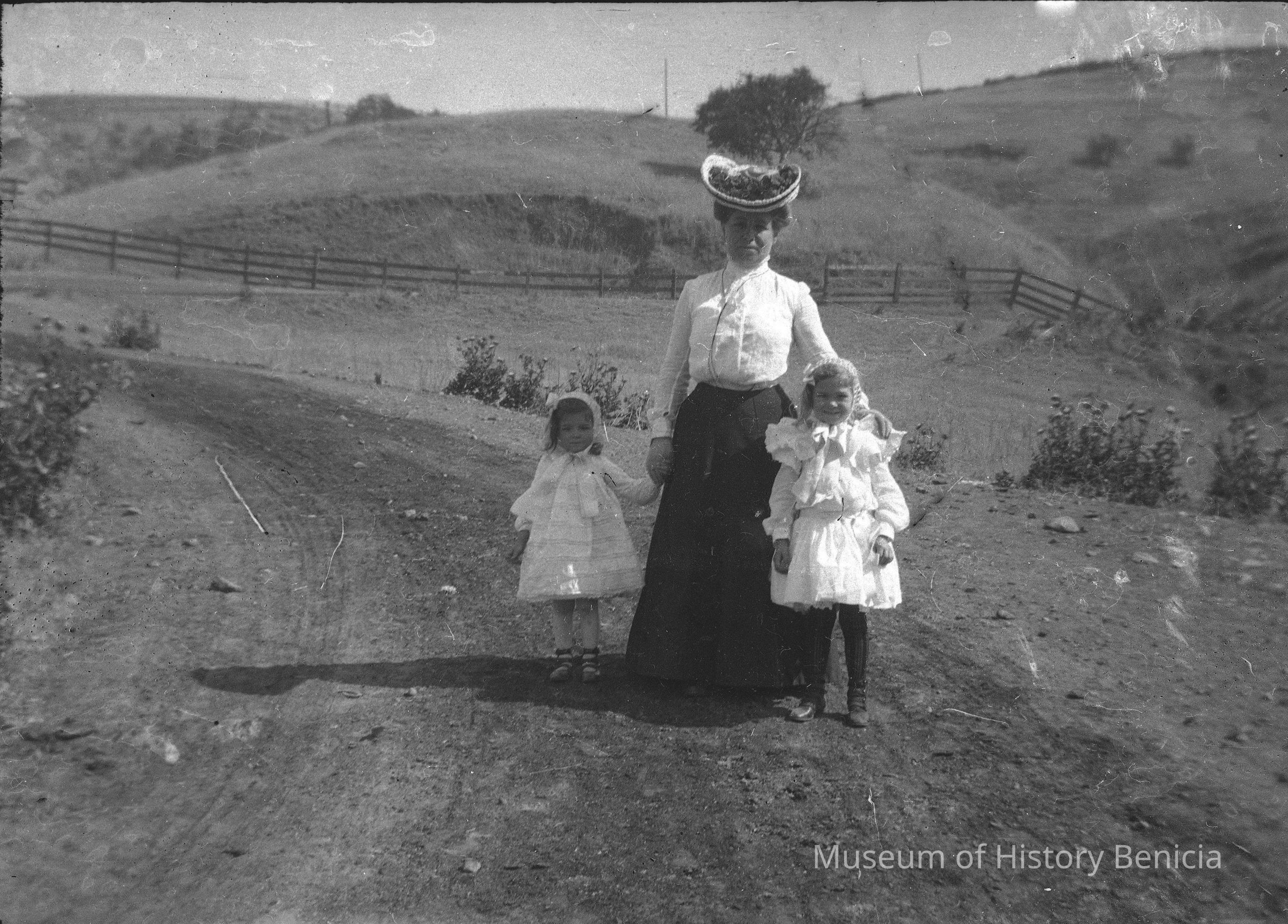 A woman and two young girls standing in an open field. The woman is Dita Molfino and the children are probably Marguite and Violet Molfino.