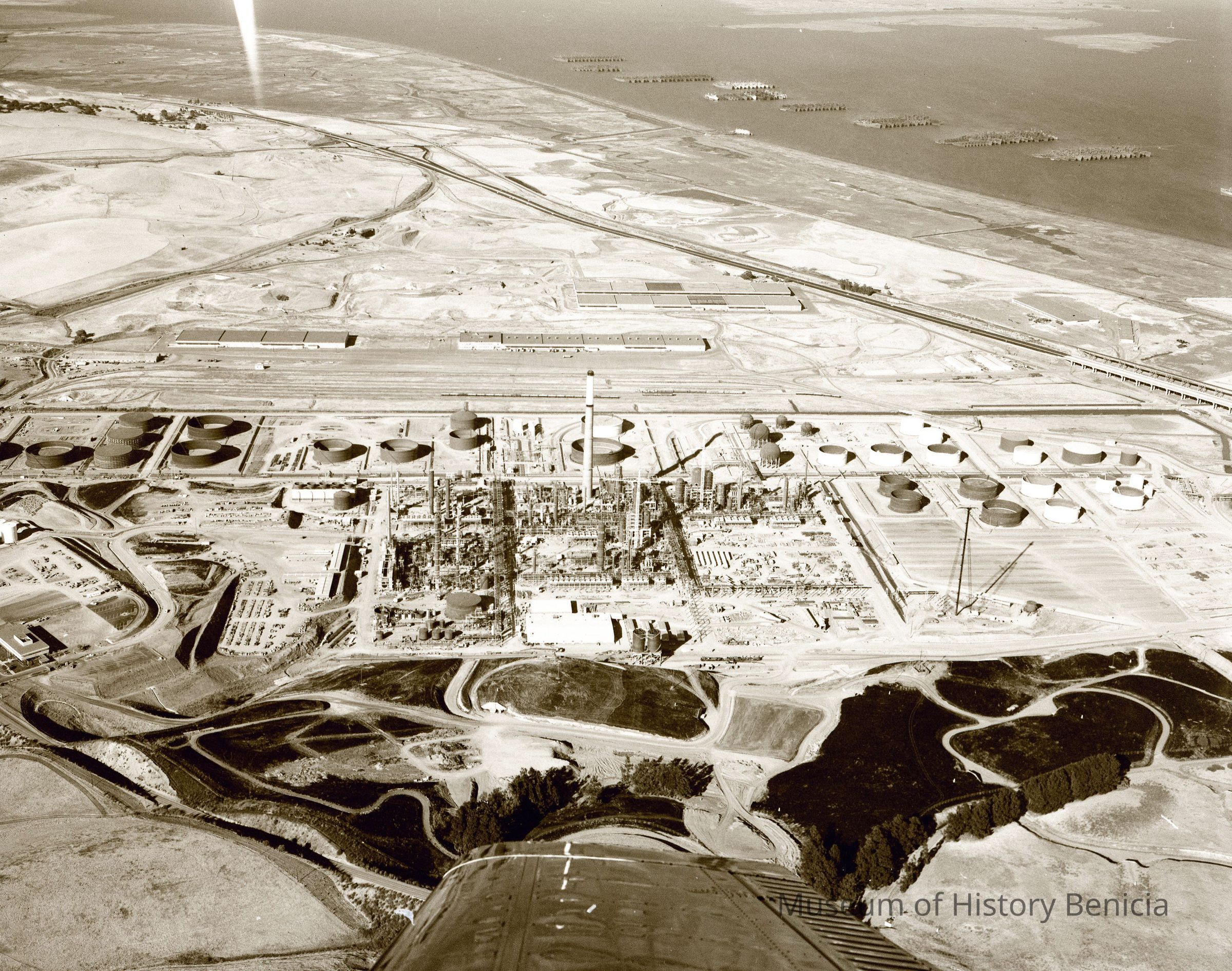 The negative was cropped on all sides to focus on refining area and remove the airplane wing at the bottom.Collection