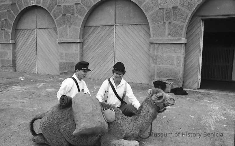 B/W negative Larry Rogers and Dave Stevens (Civil War buffs) at Camel Barn Museum outside with Atar the camel matches photograph BHM99.99.110