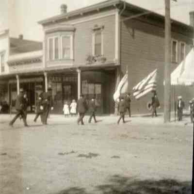 B/W negative of parade down First Street by "J" and "I". The one story building at left is Pacific Pizza.