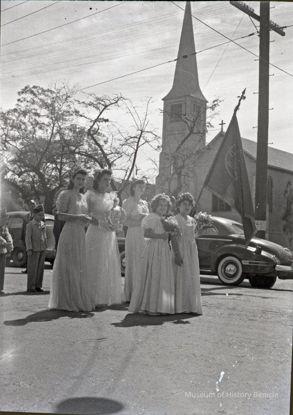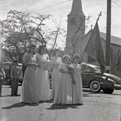 B/W negative of parade down First Street, group of five women stopped in front of St. Paul's Church