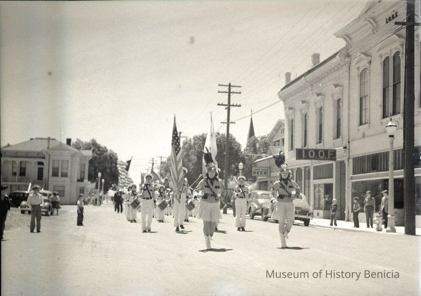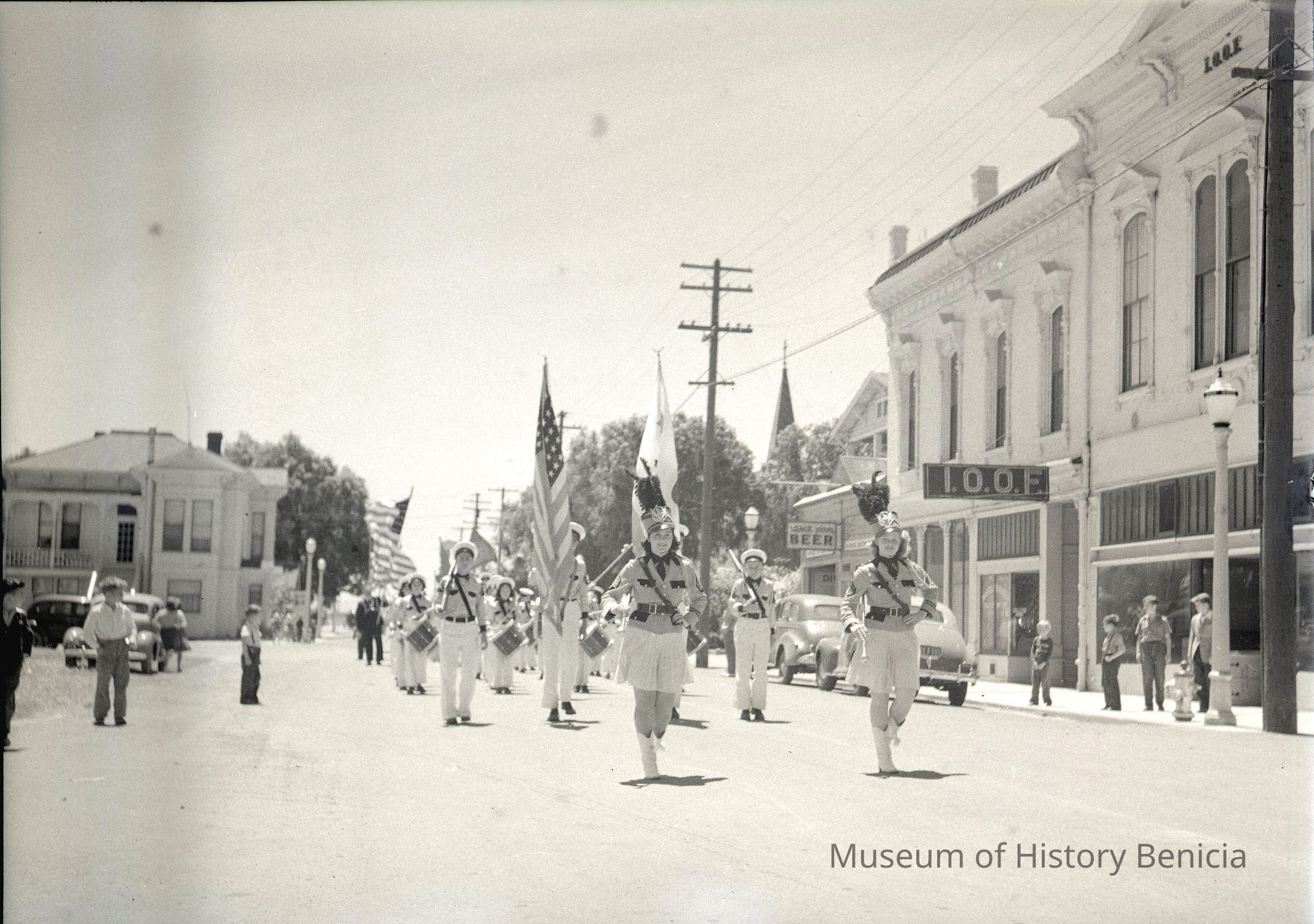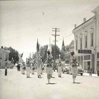 B/W negative of parade in Suisun City "IOOF" can be seen on a building. People marching with a band and flags
