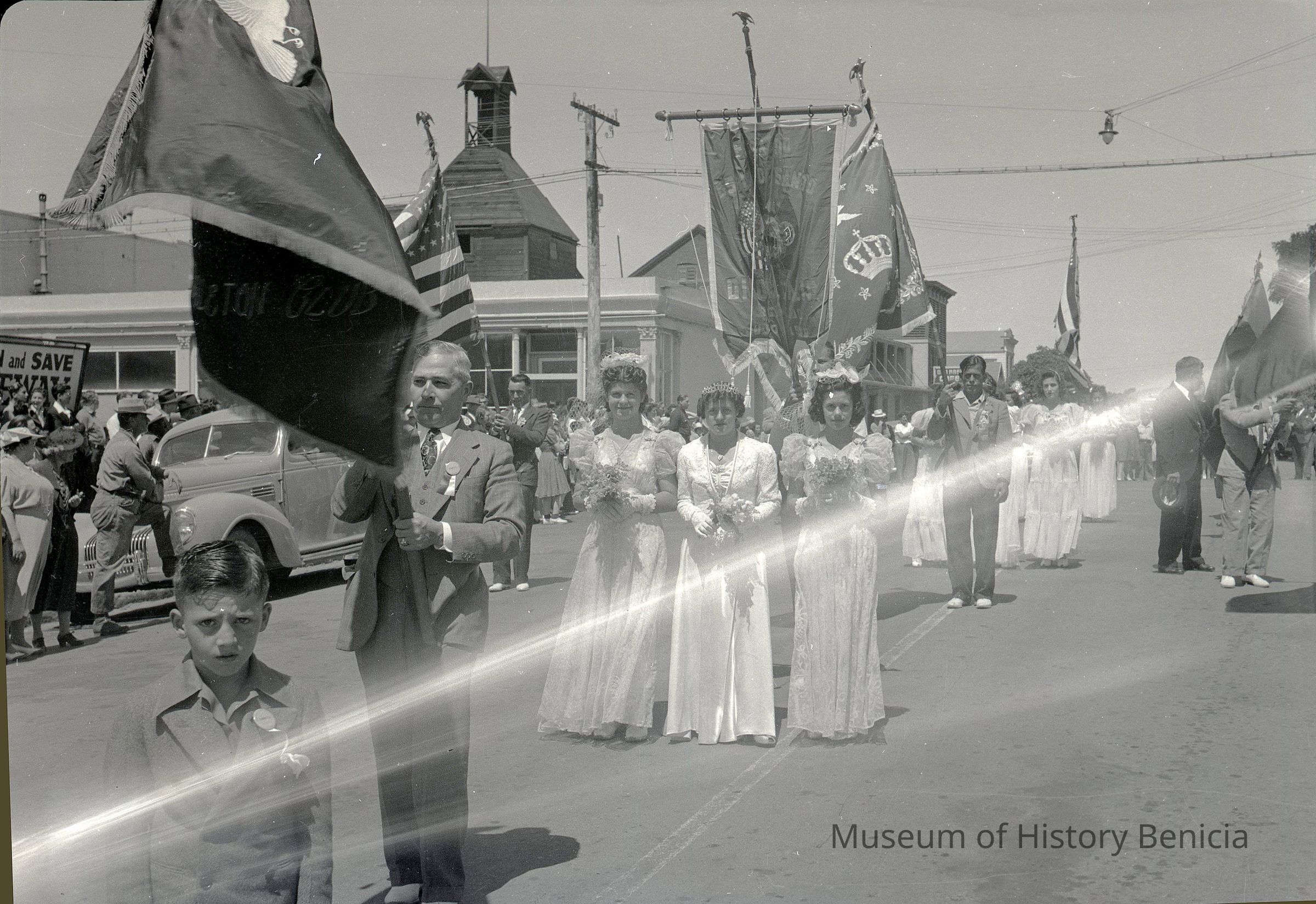 B/W negative of a Holy Ghost parade on First & "H" Streets looking west. California House and Benicia Brewery in left background