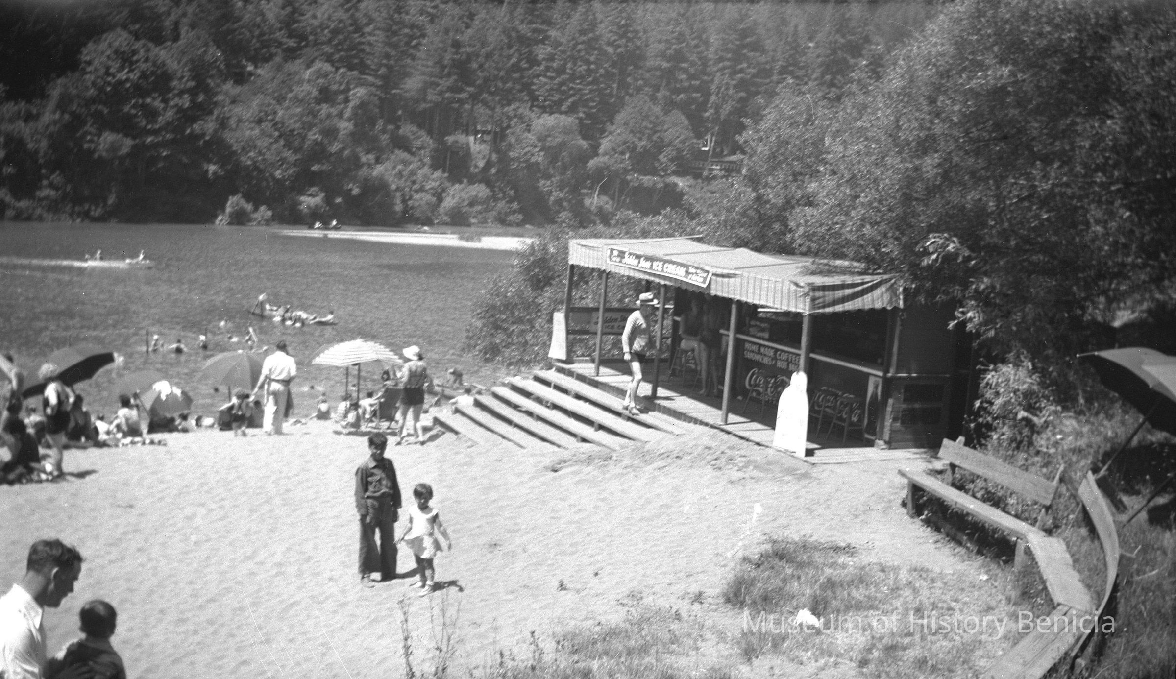 B/W negative - appears to be taken at a lake resort (perhaps). There is a snack building to the right, no name is readable but they offer ice cream and CocaCola and coffee and other unreadable items; to the left people can be seen along the beach and also people are in small boats on the water; there are also benches and unbrellas visibleCollection