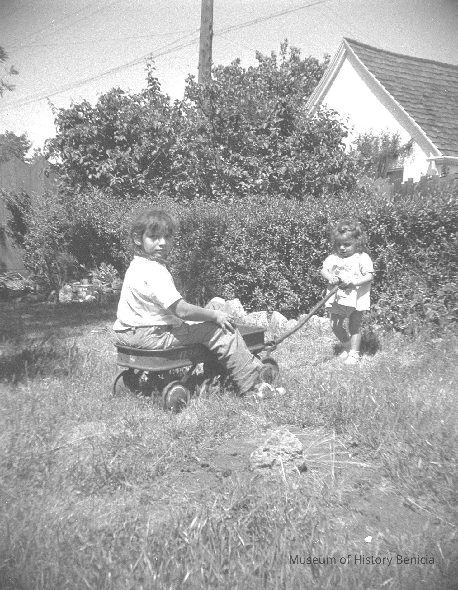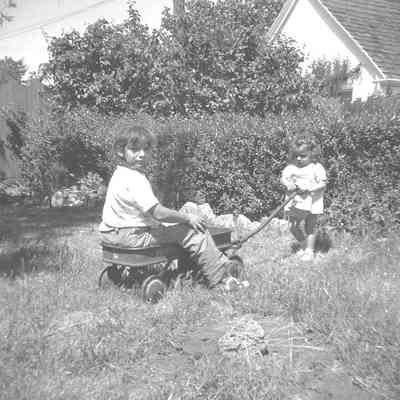 2009.007.0021.3 - B/W negative - bacyard scene: 1 young person "pulling" a wagon with 1 other person in it;
