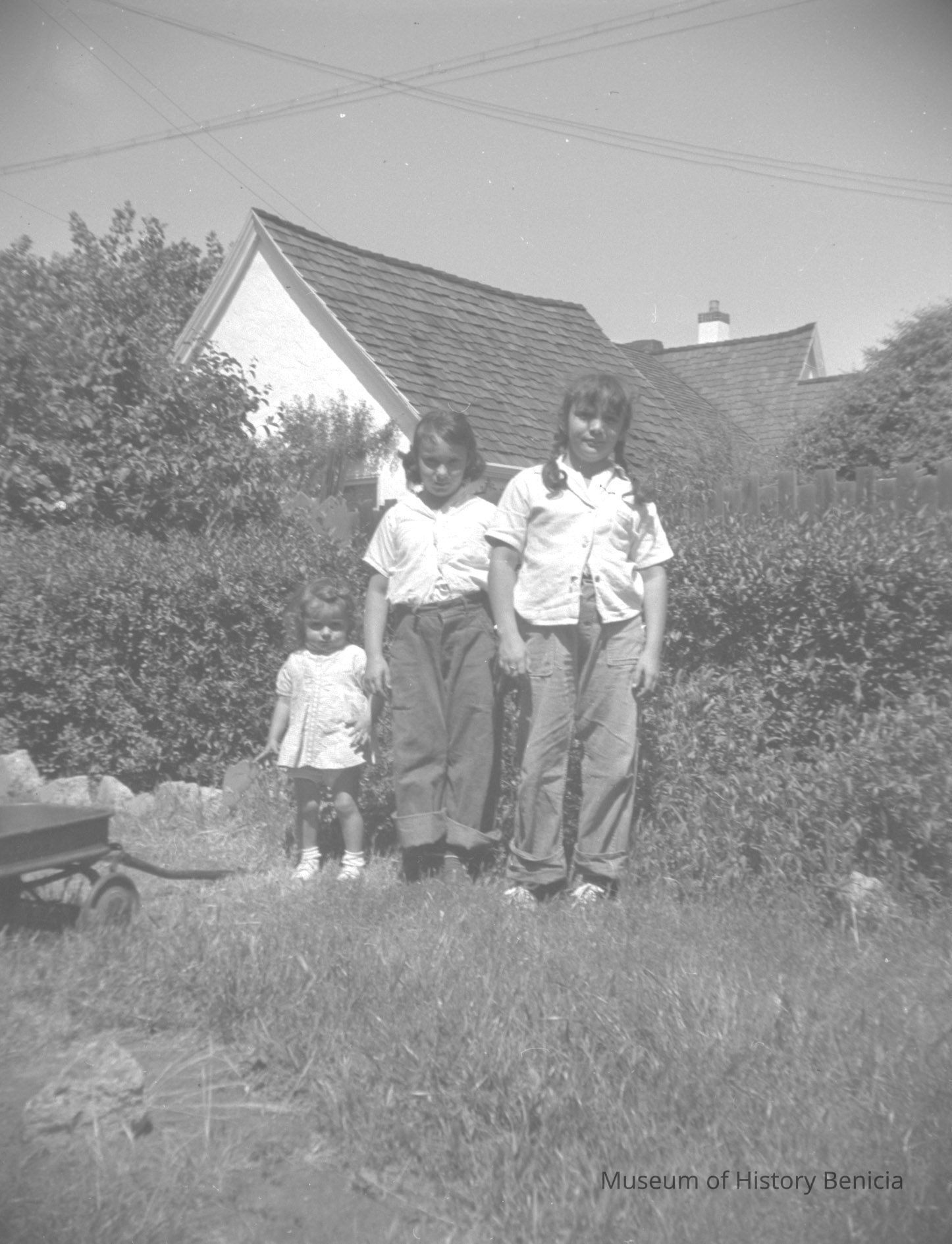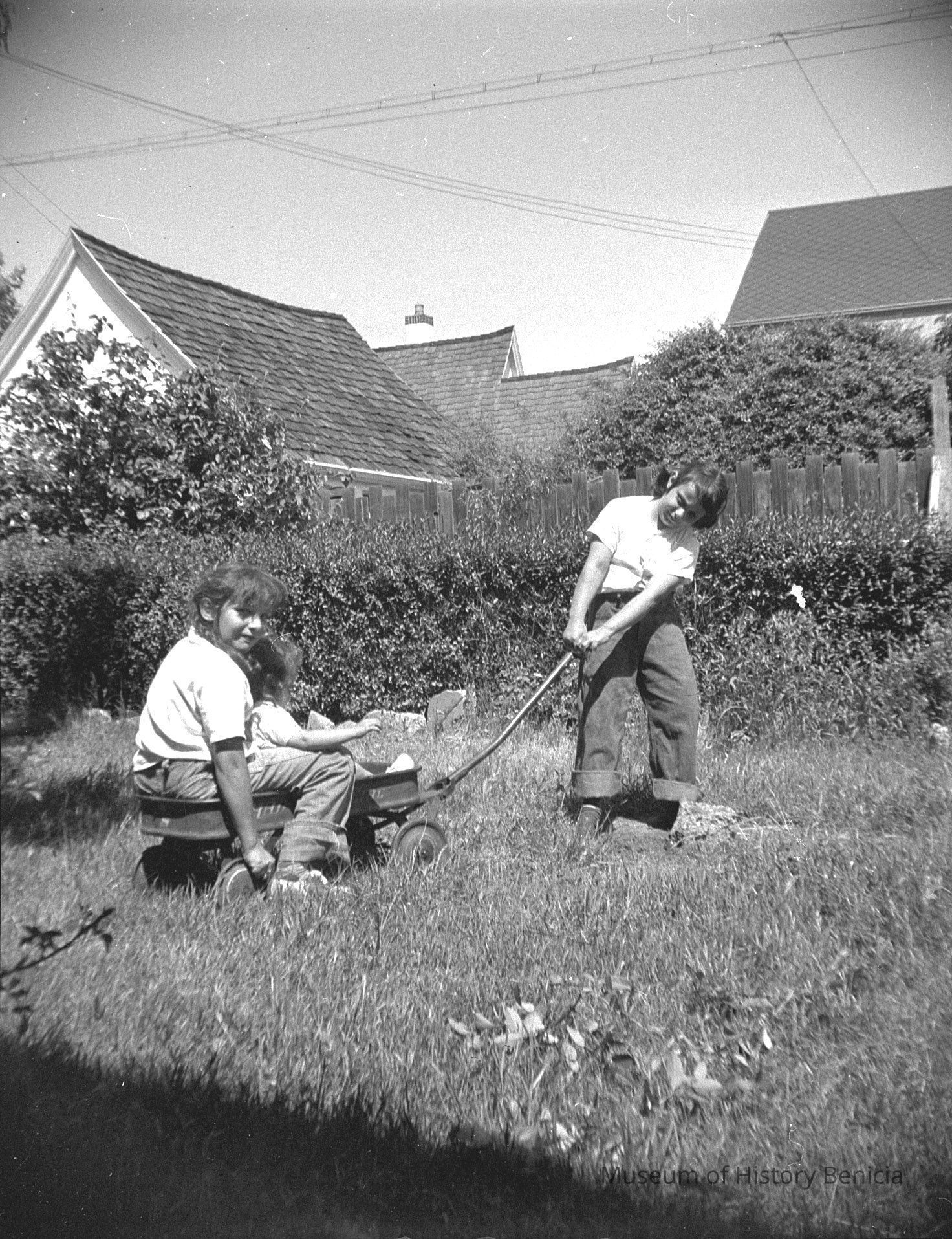 2009.007.0021.2 - B/W negative - backyard scene: 1 young person "pulling" a wagon with 2 others in it;