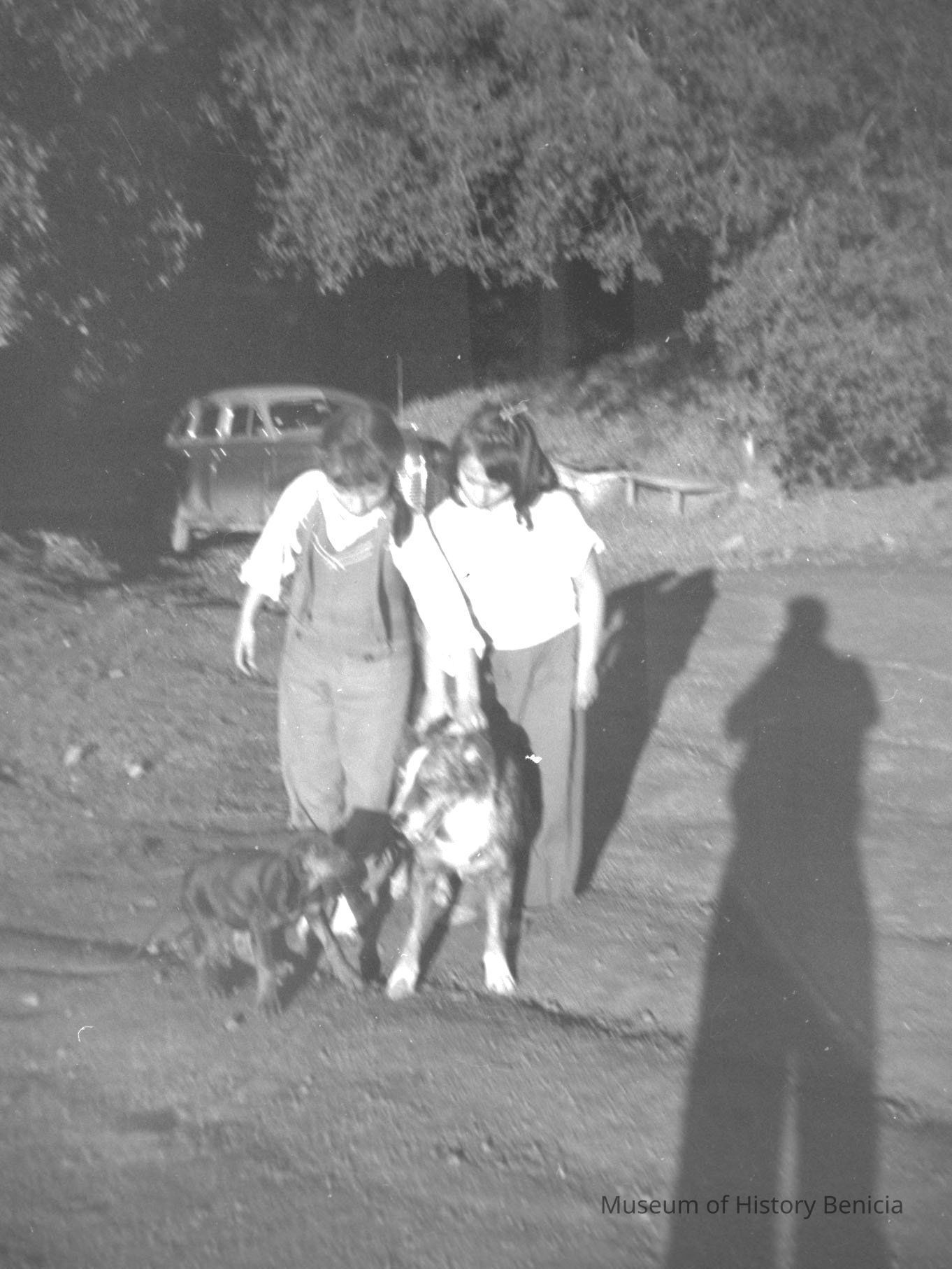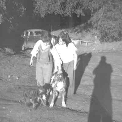 2009.007.0028.2 - B/W negative - 2 young people with 2-3 dogs on rural road, auto in background, shadow of photographer at right;