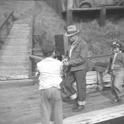 2009.007.0028.4 - B/W negative - a man and two young people on what appears to be a wooden walkway, cannot decipher background, (may be near a boat launch/pier).Collection