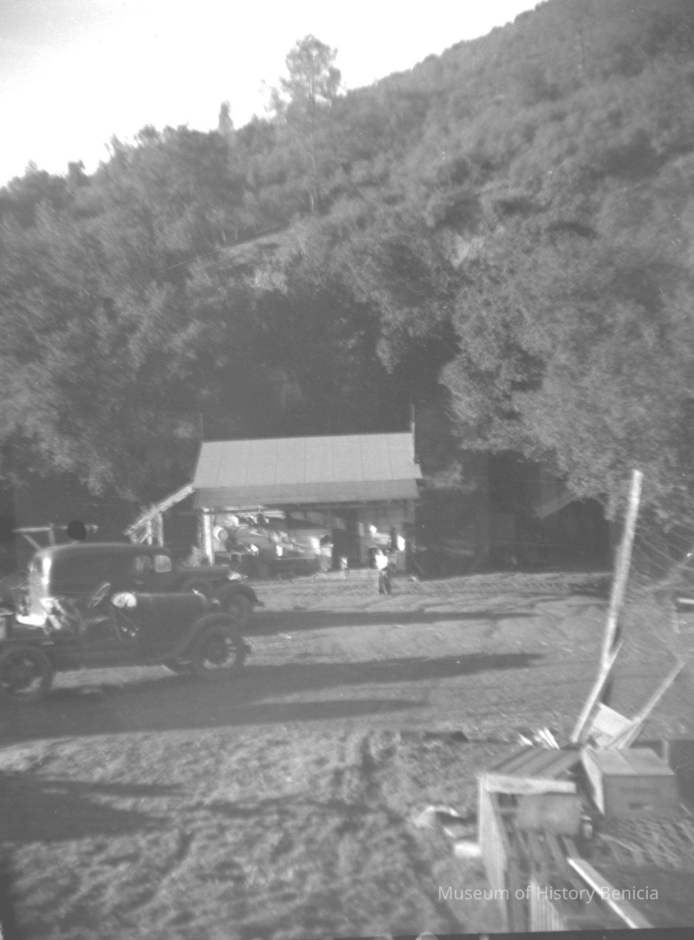 2009.007.0028.1 - B/W negative - rural scene, a line of autos with an outbuilding in background, cannot identify details;
