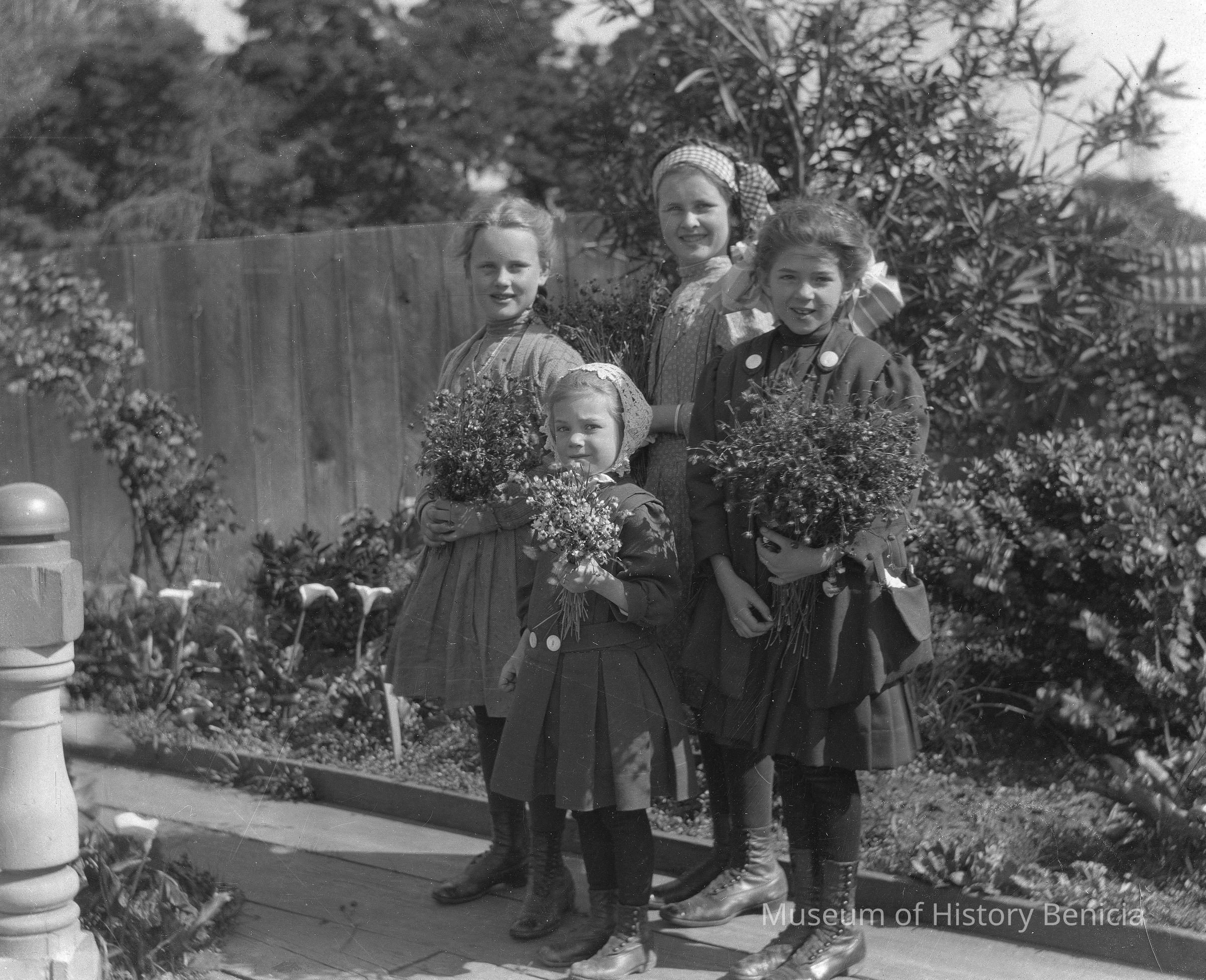 Four girls, each holding a bouquet of flowers. The two girls in front are Violet and Margurite Molfino.