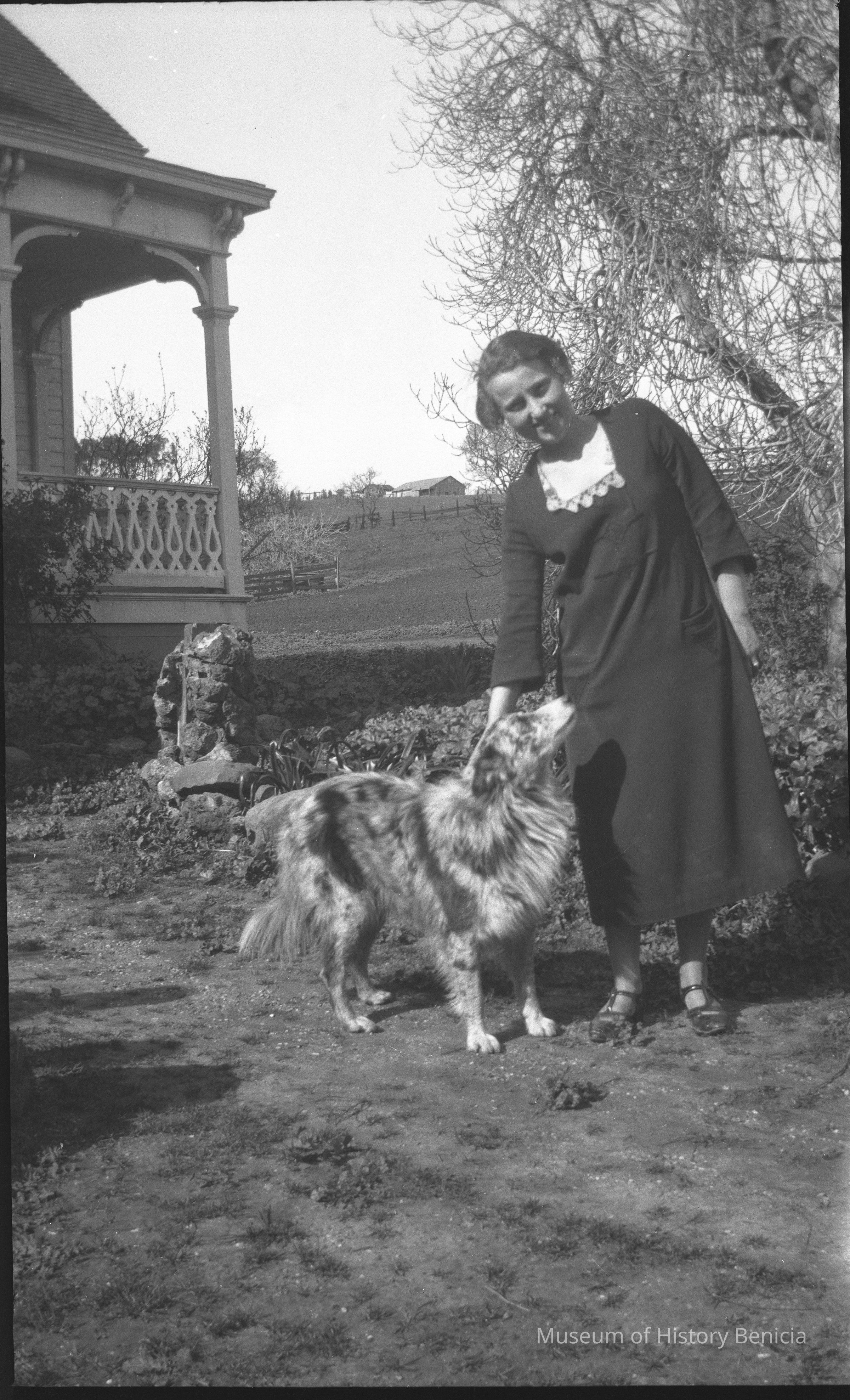 Woman in yard with dog.