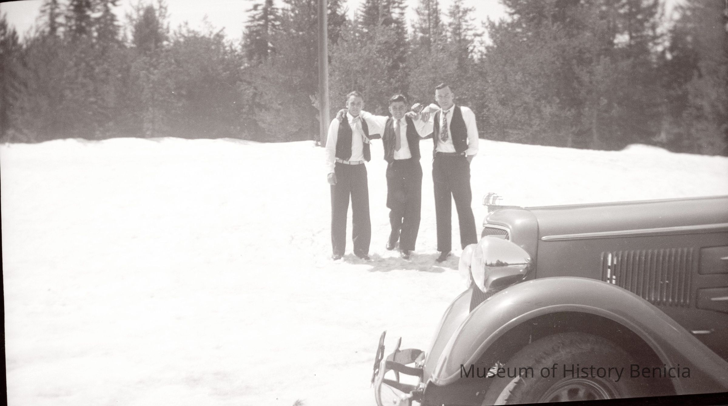 This shows three guys in the snow wearing vests and ties behind an old car.