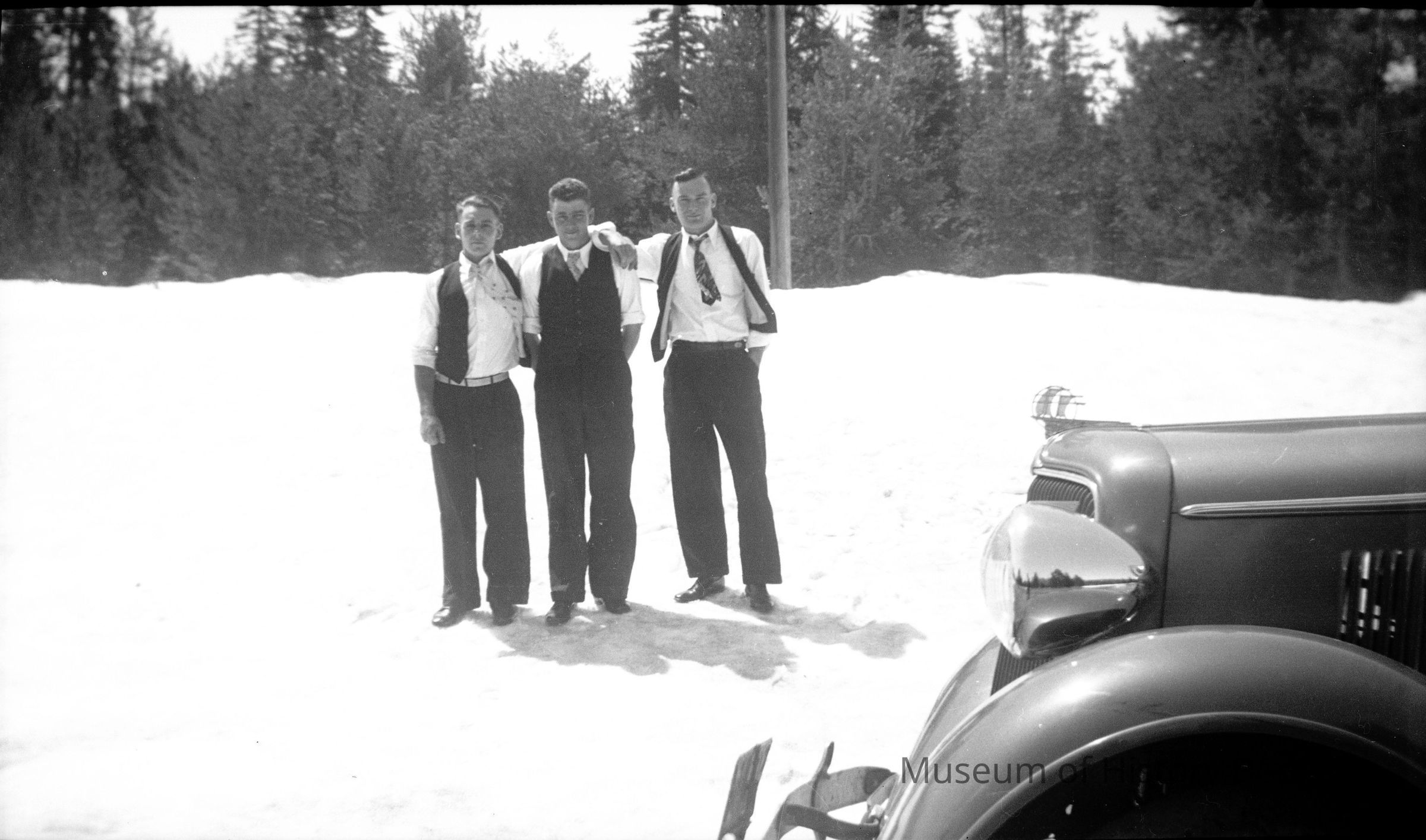 This shows three guys who are seen in other photos. They seem to be in the mountains and on a road trip. The car is a 1934 Plymouth based on the hood ornament.