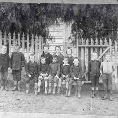 a copy of a photo of kids in front of a school