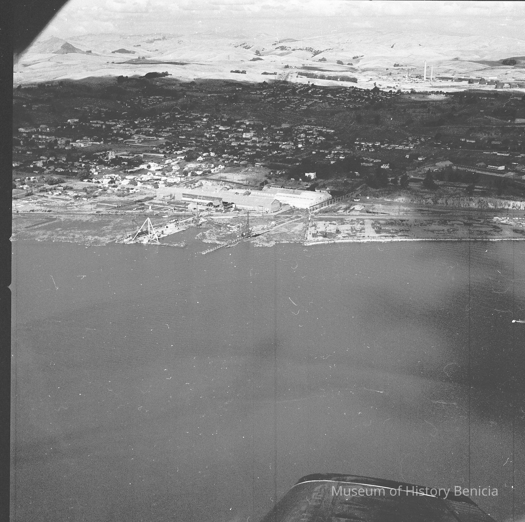 B/W negative of coast line of Carquinez Straits in old Yuba area, City of Benicia appears to be in the background. Healy Tibbitts Construction Company