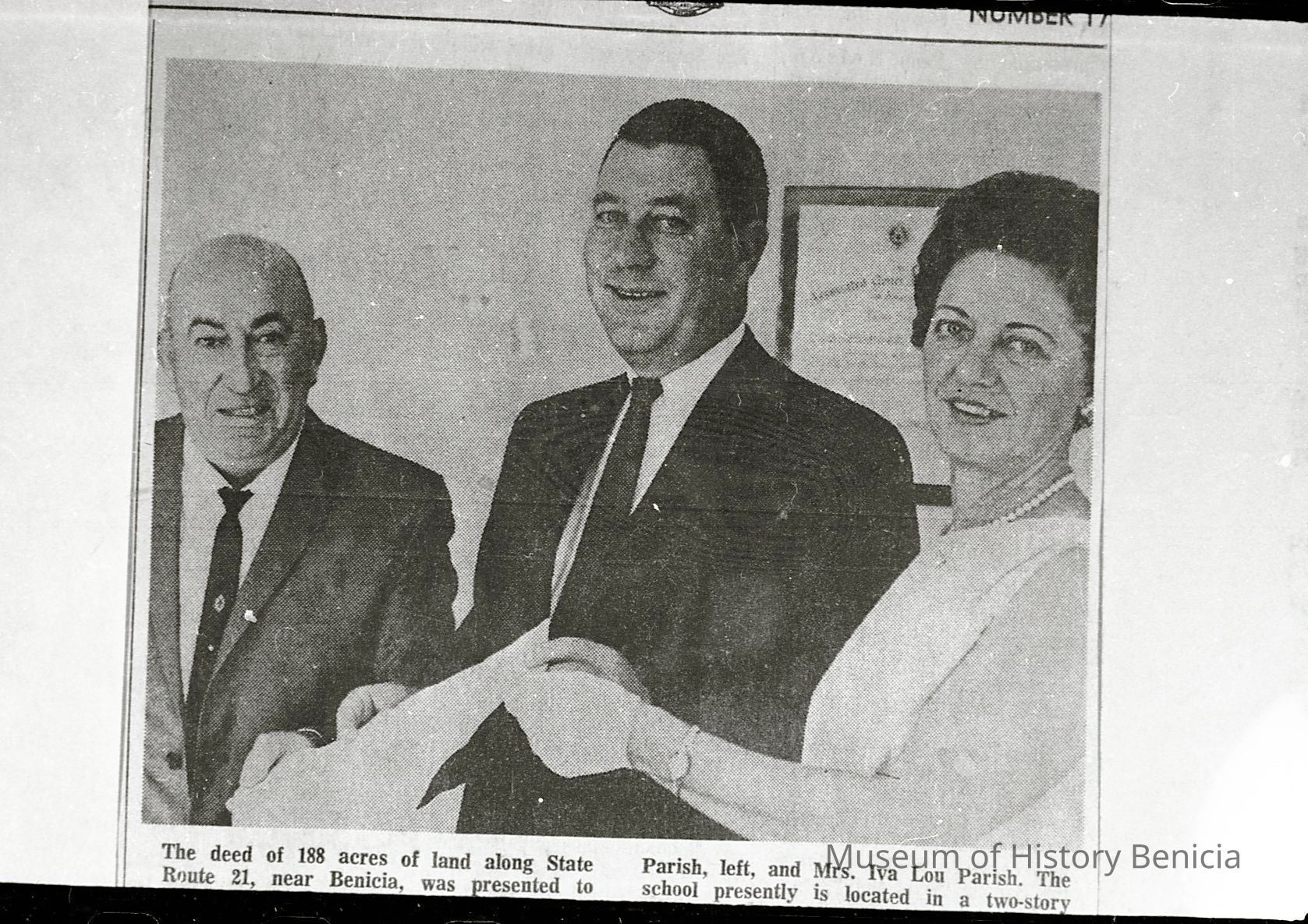a newspaper photo of the deed to 188 acres along State Route 21 being transferred