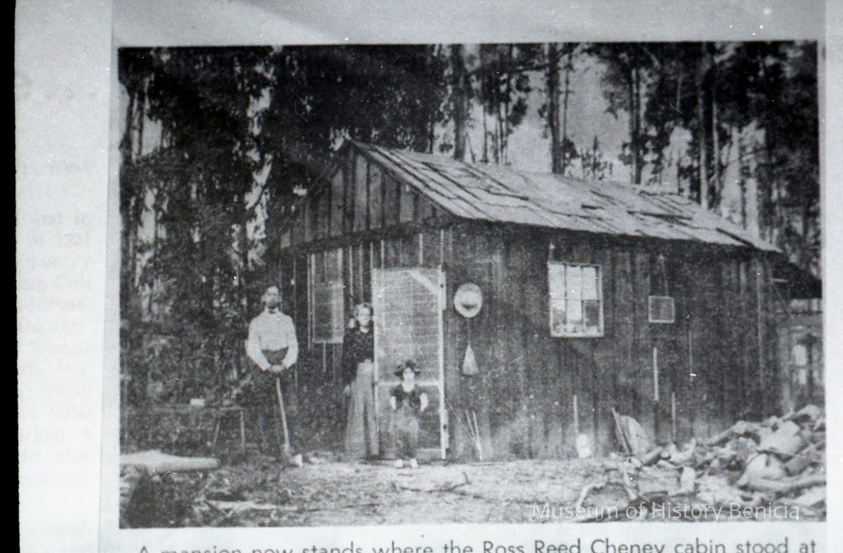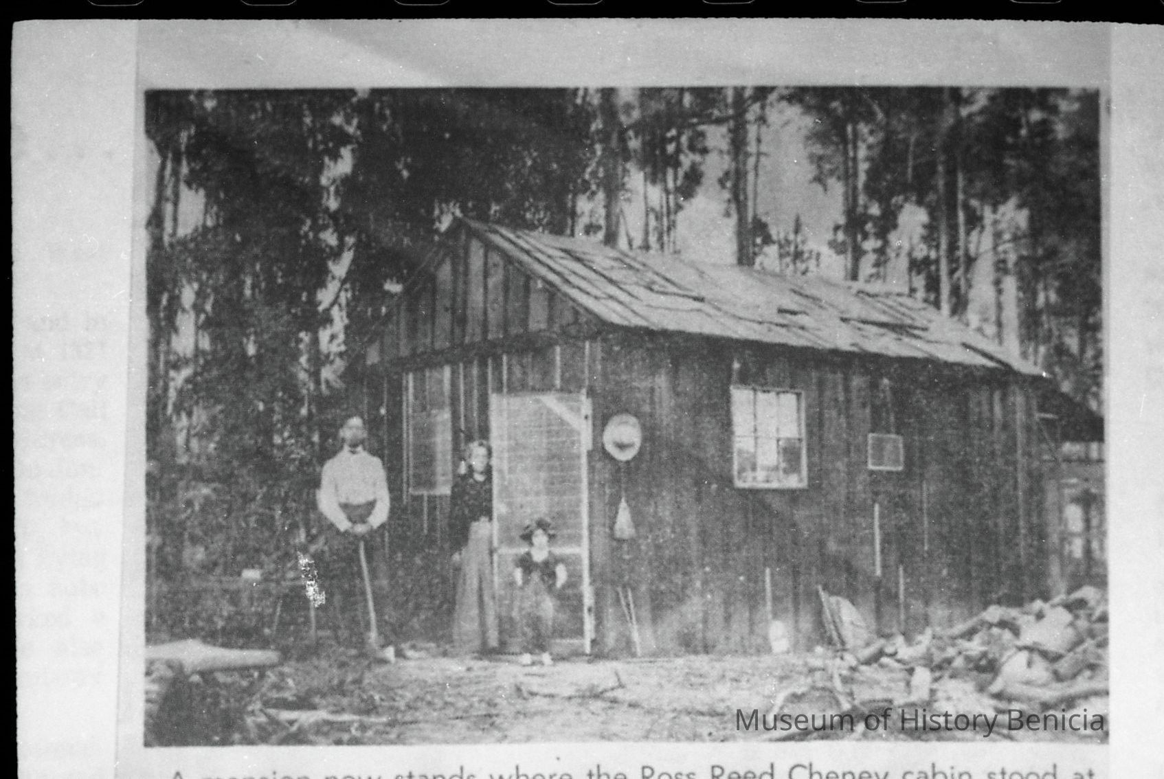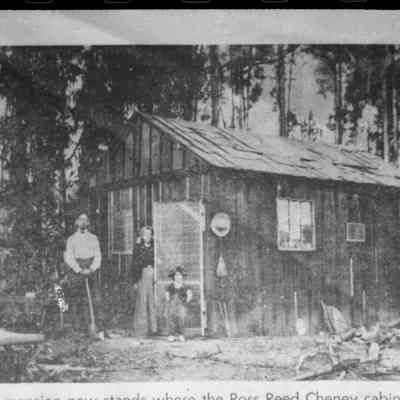 cabin photo from newspaper with people standing outside