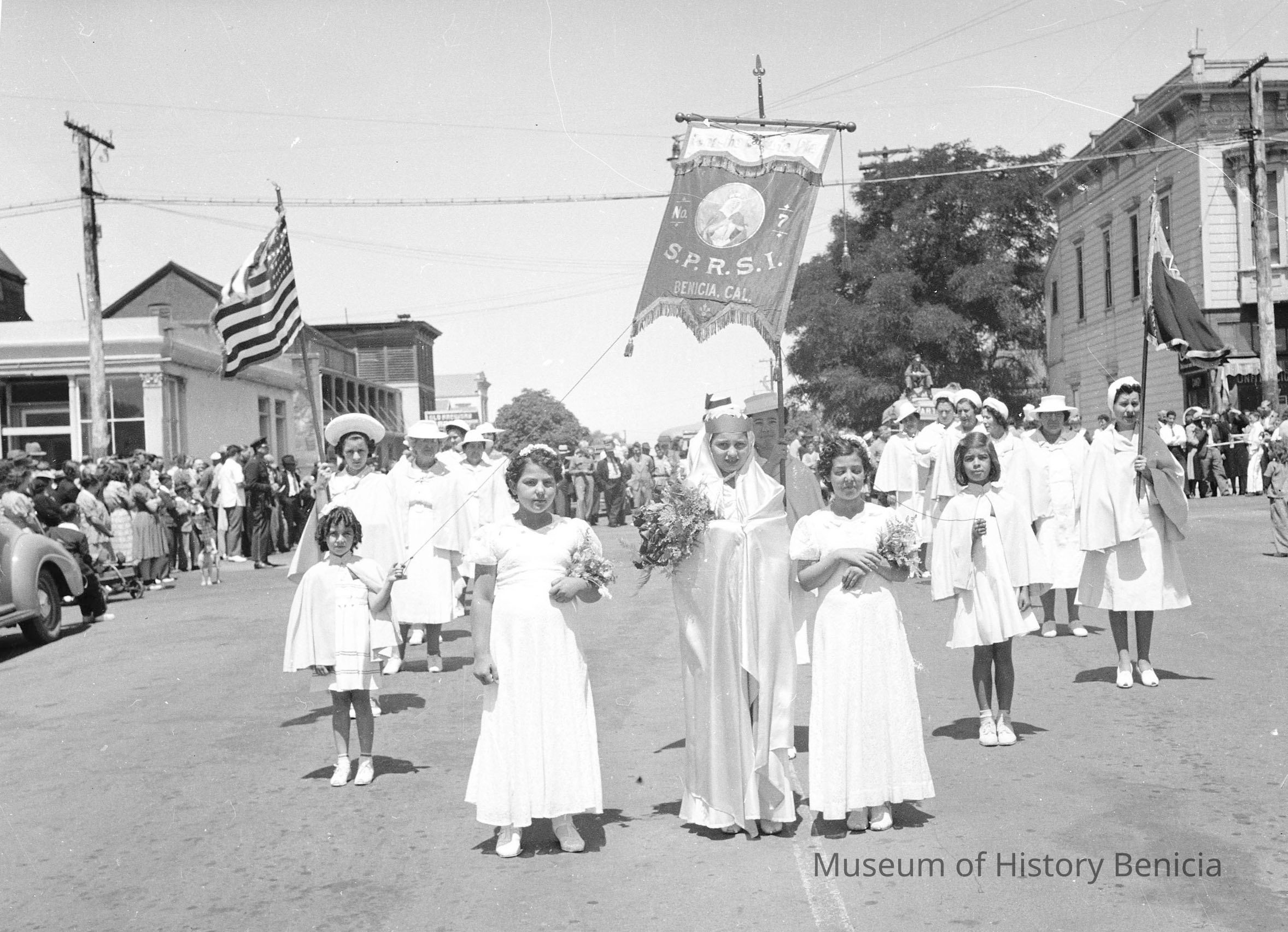 B/W negative of women from the Benicia S.P.R.S.I. on First street. There is a Martinez bus in the background with the driver on top.