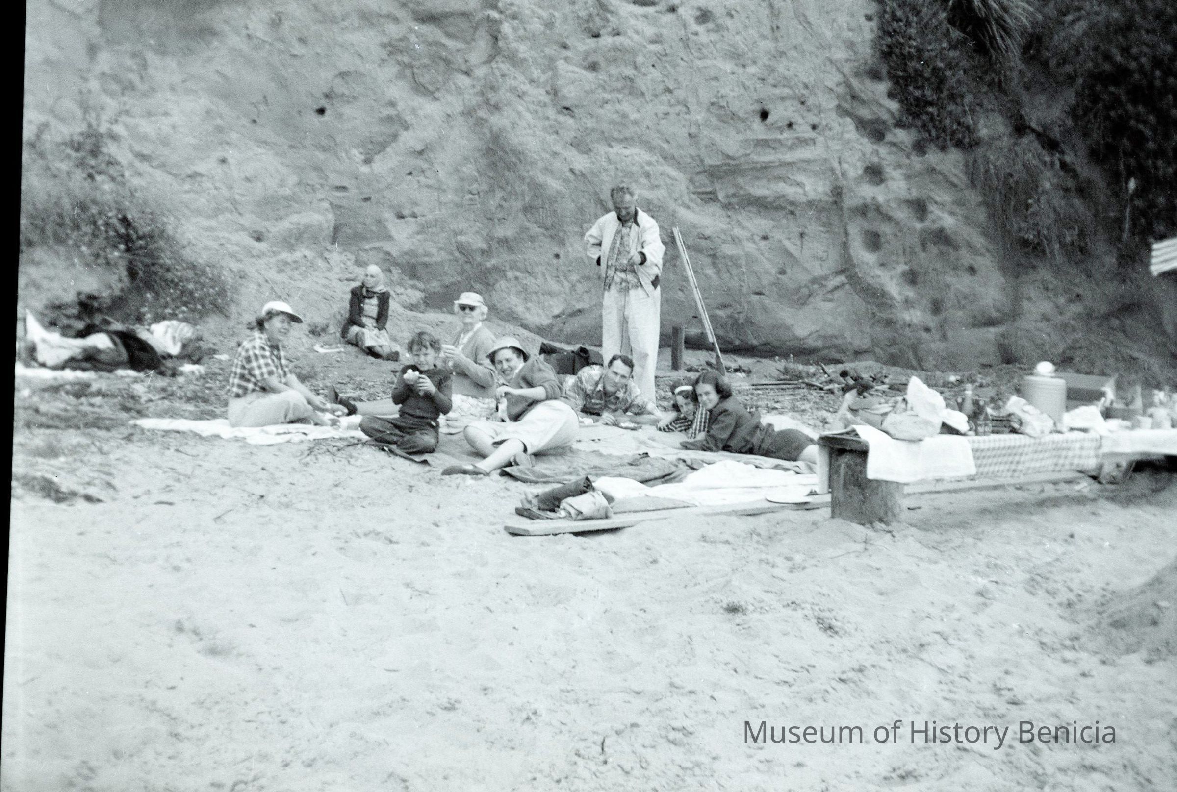 B/W negative of people at Ocean Beach in San Francisco having a picnic. The man laying down in the center is Harry Wassmann.