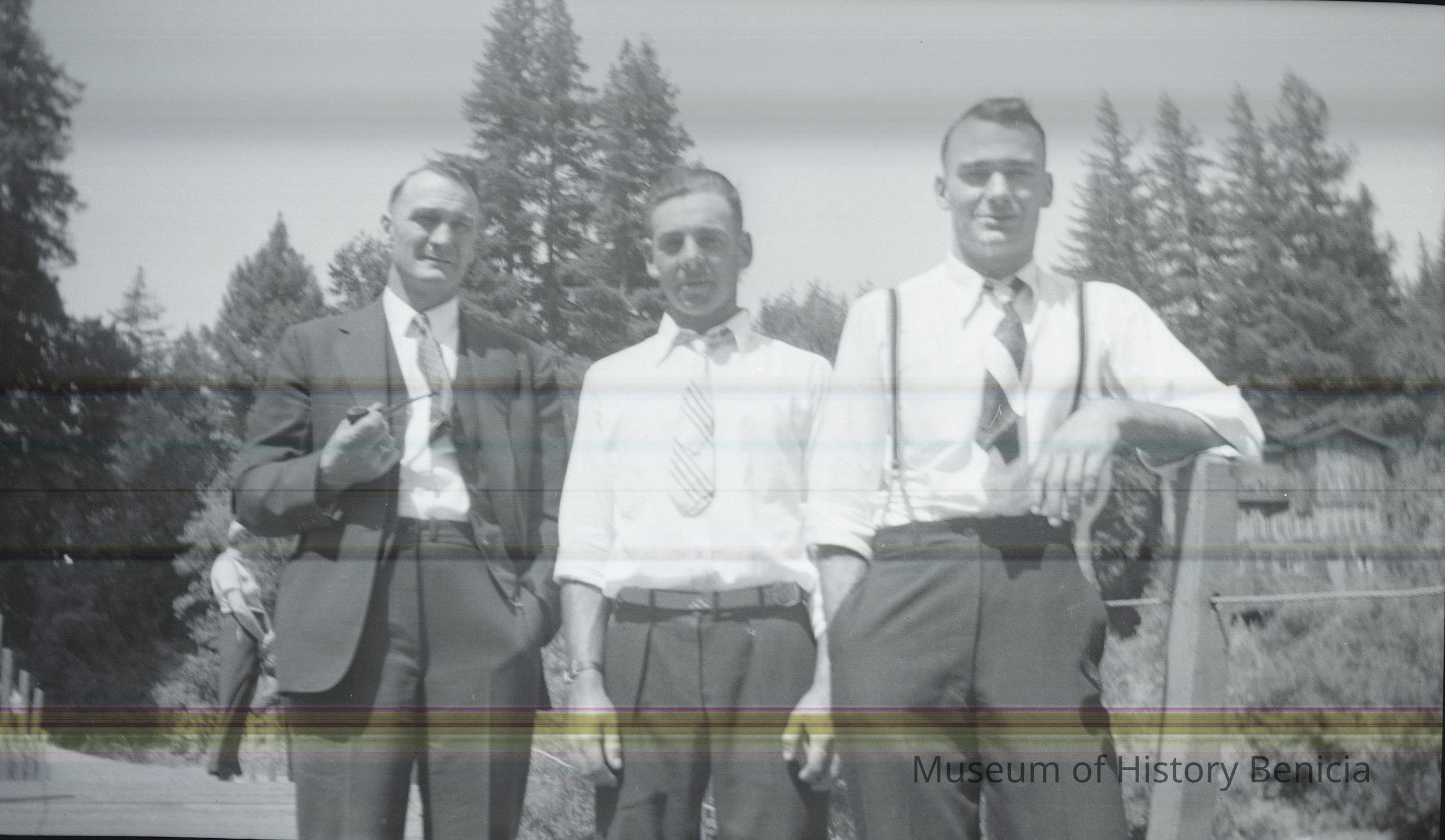 B/W negative of two young men in the Sierra's with an older man. The older man looks like a Wassmann.