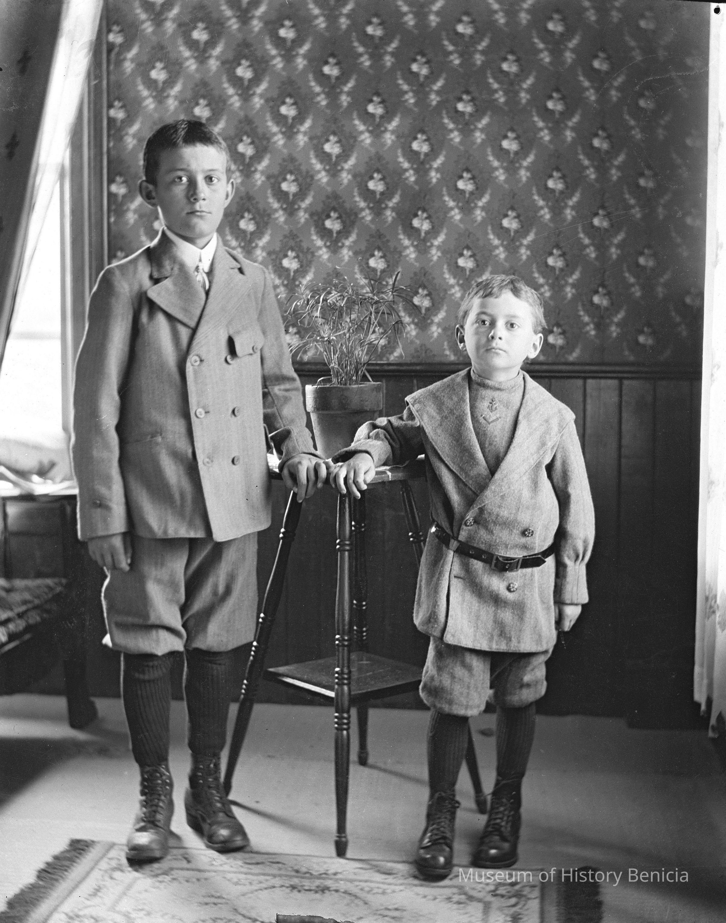 Two boys with their arms resting on the plant stand between them. Same boys as in 2004.001.0459 and 0460.