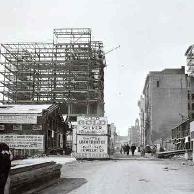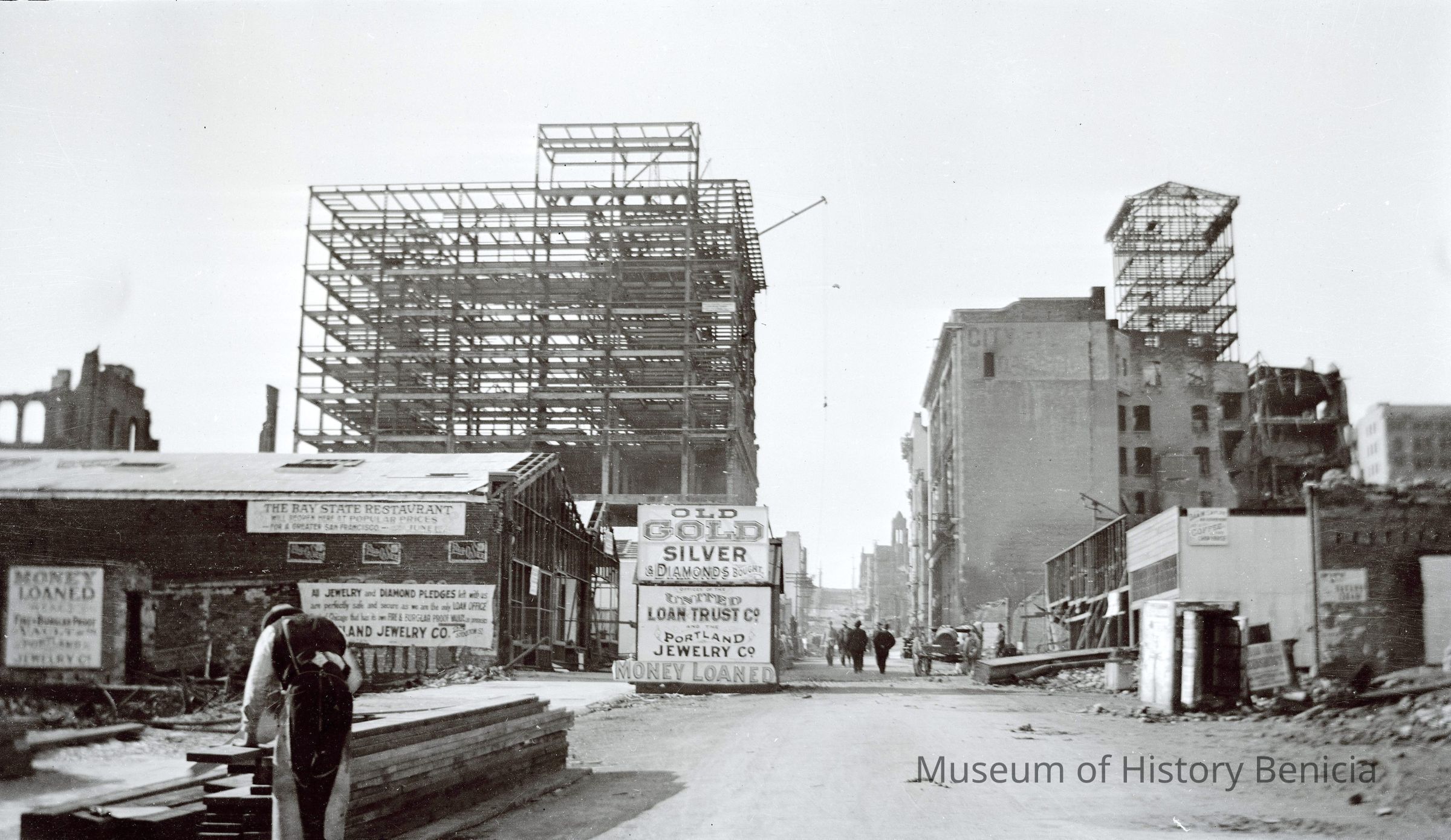 This photo is one of a series of photos of San Francisco after the 1906 earthquake. It shows the start of the city rebuilding. There is a man cutting wood in the foreground, a sign for the coming of the Bay State Restaurant opening on this spot, signs for pawn shops and an old motor vehicle on the right.