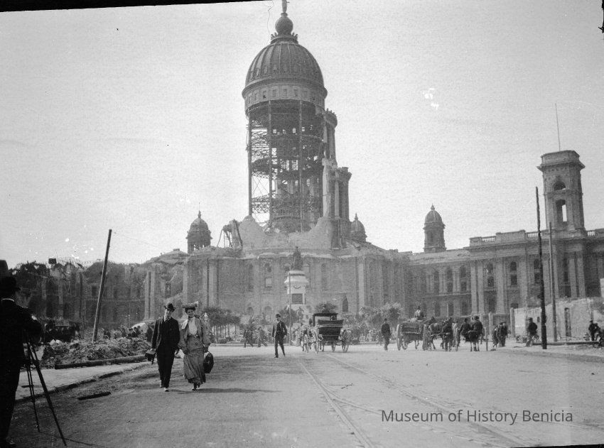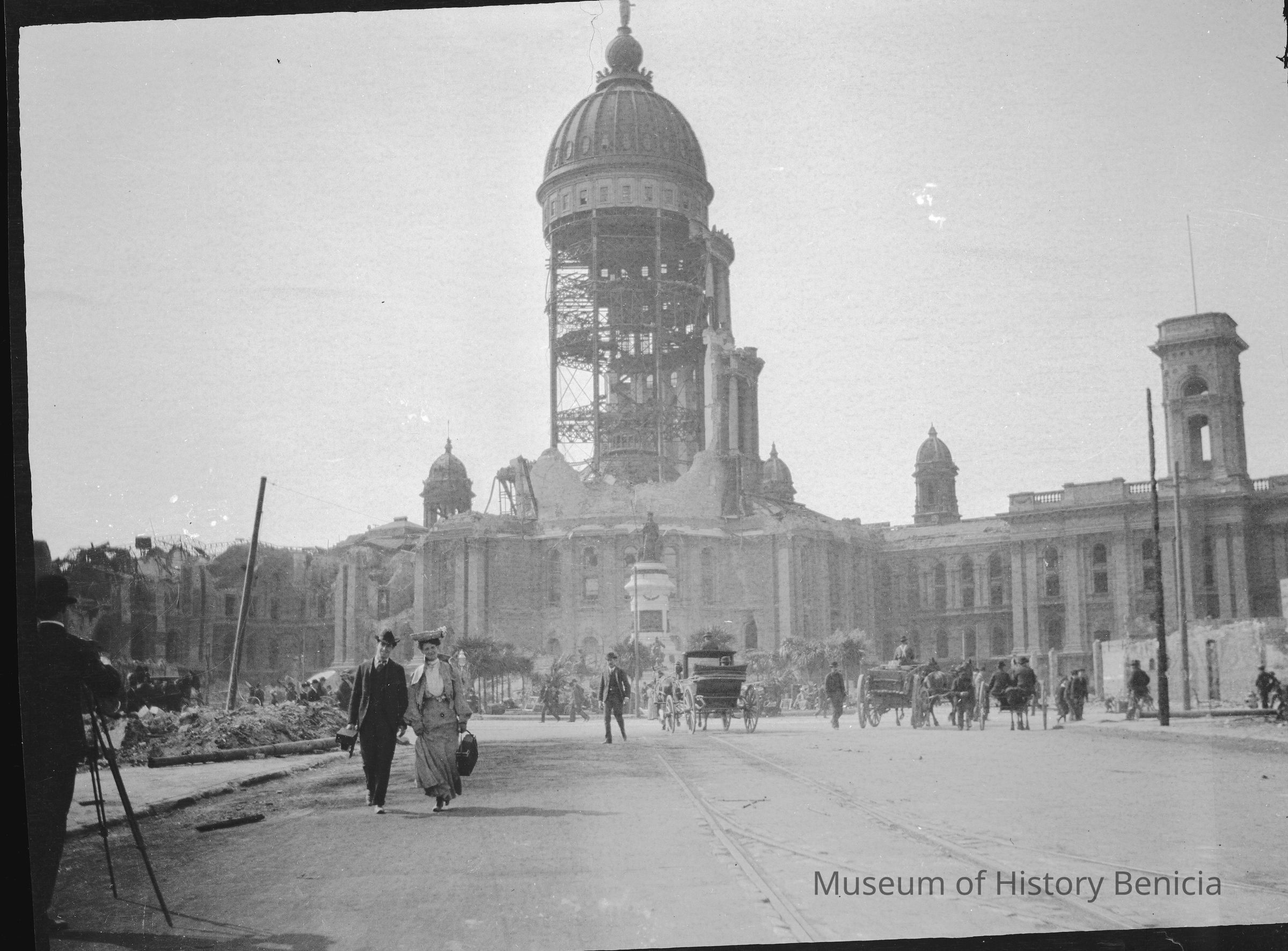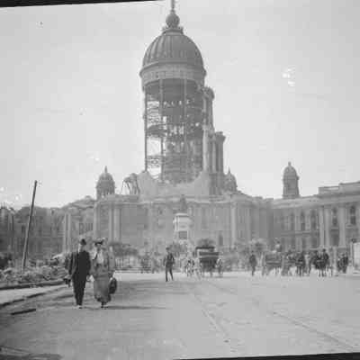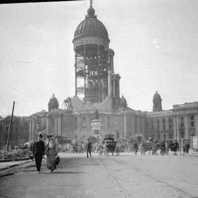 This photo is one of a series of photos of San Francisco after the 1906 earthquake. This photo shows San Francisco City Hall. On the left is a man with a camera on a tripod taking a photo of a couple who have their own camera.Collection