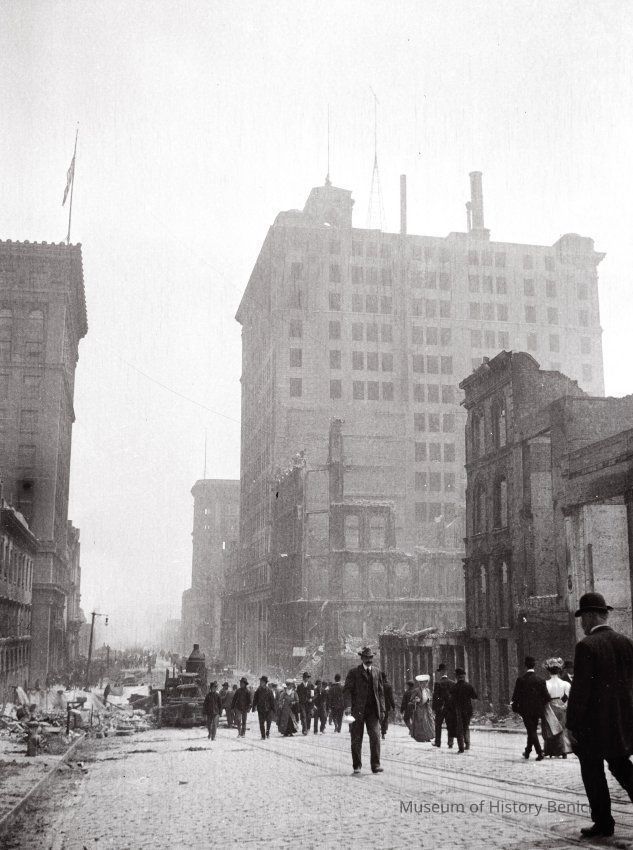 This photo is one of a series of photos of San Francisco after the 1906 earthquake. This photo shows a group of people maybe on their way to work. The man and woman in the center of the photo are carrying small packages that could be their lunch. There are also three Chinese gentlemen on the left side of the photo.Collection