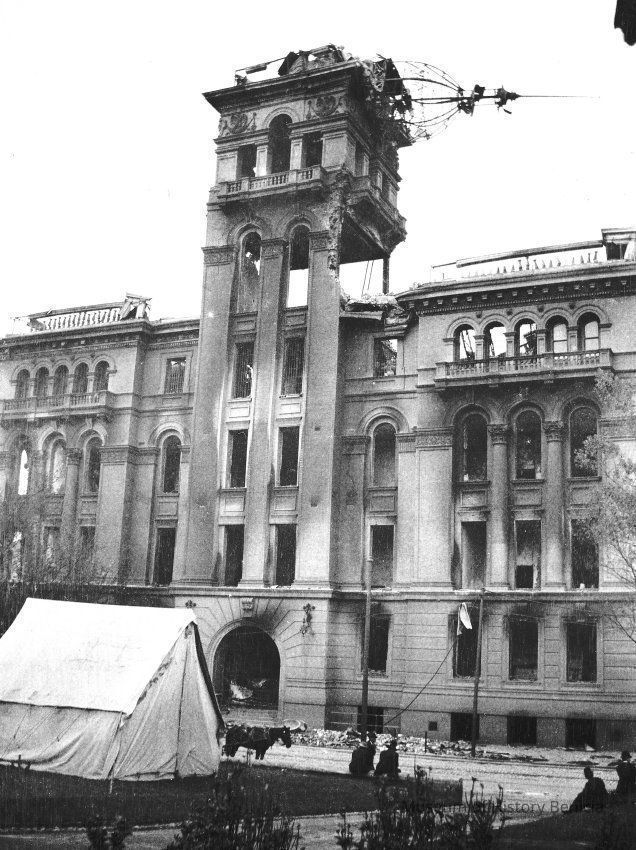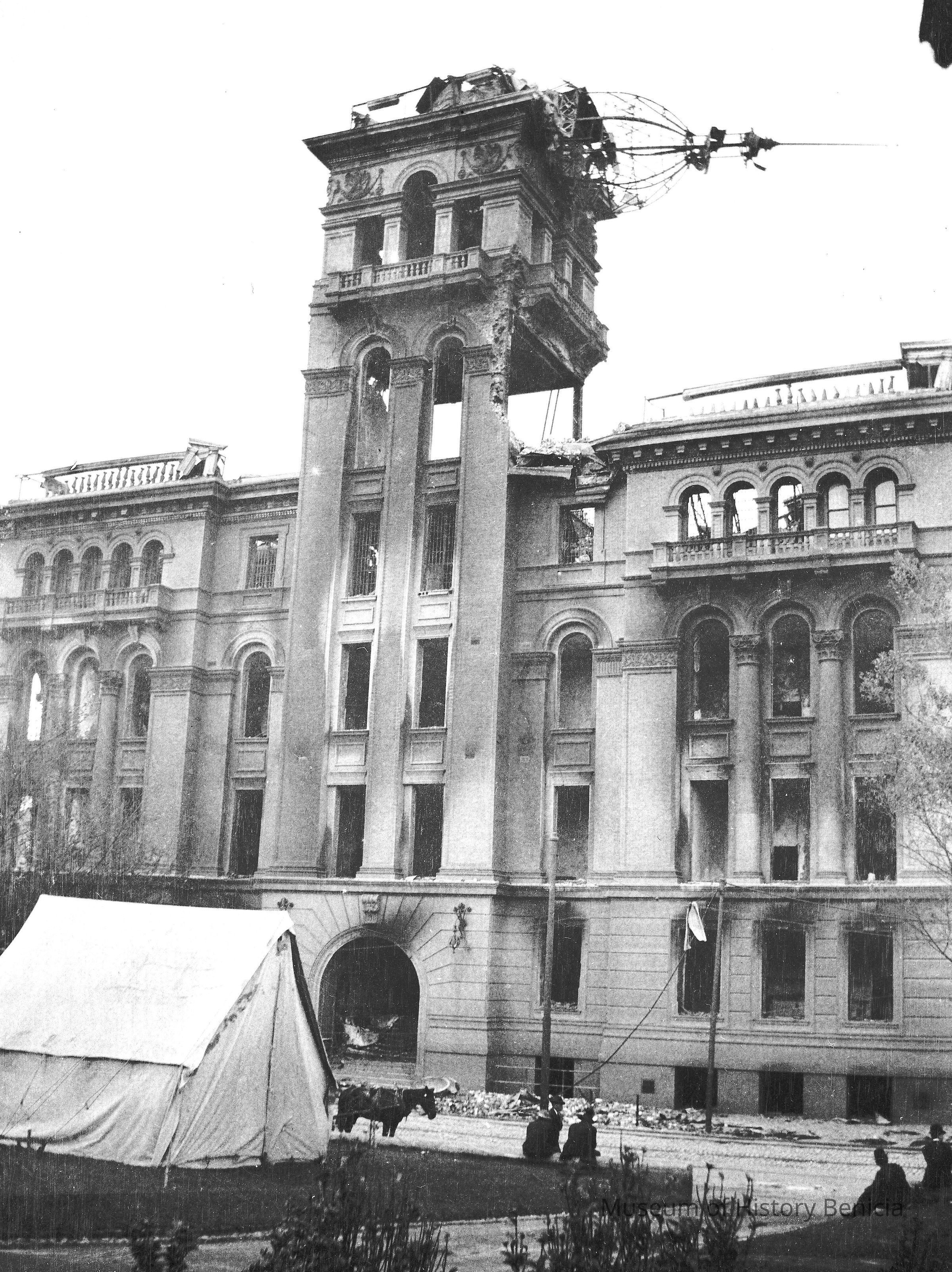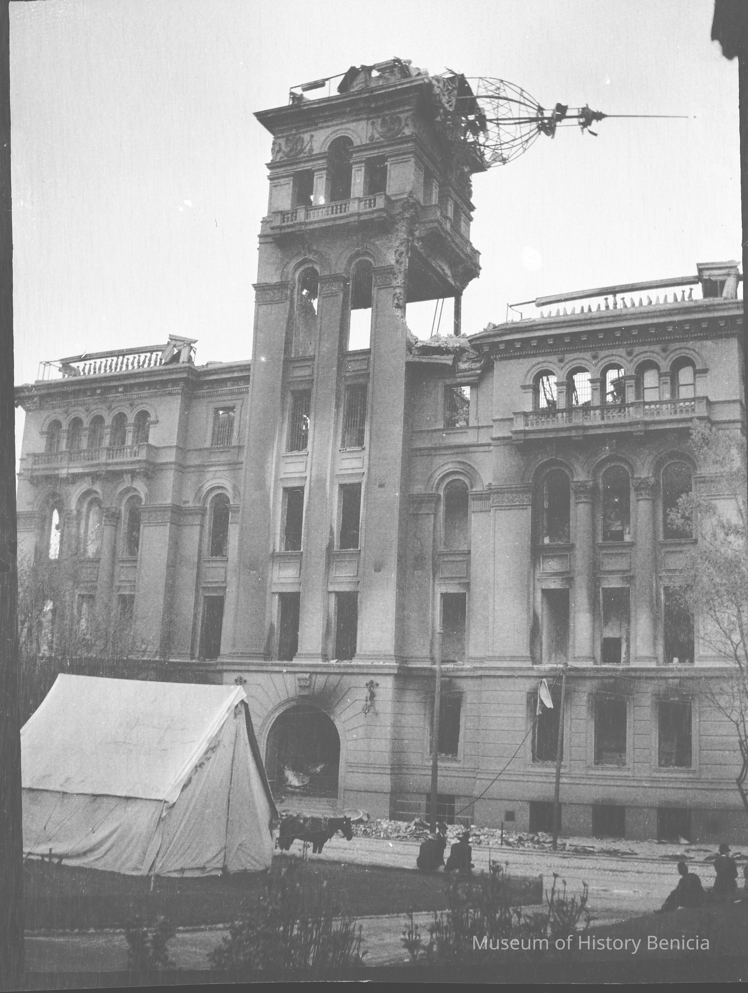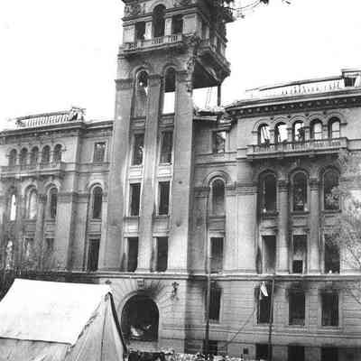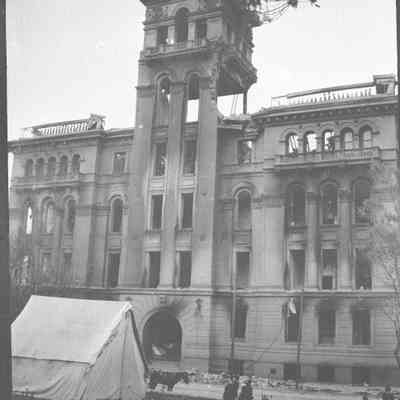 This photo is one of a series of photos of San Francisco after the 1906 earthquake. This photo shows the partially-destroyed Hall of Justice, with a refugee tent on the plaza in front.Collection