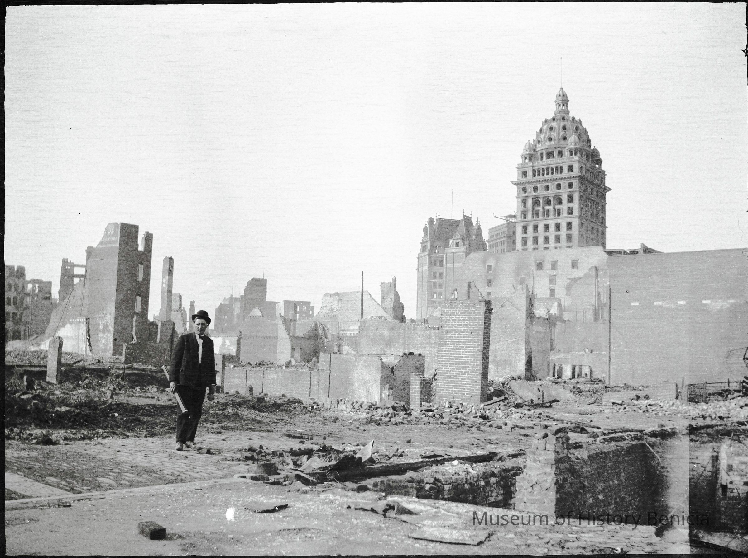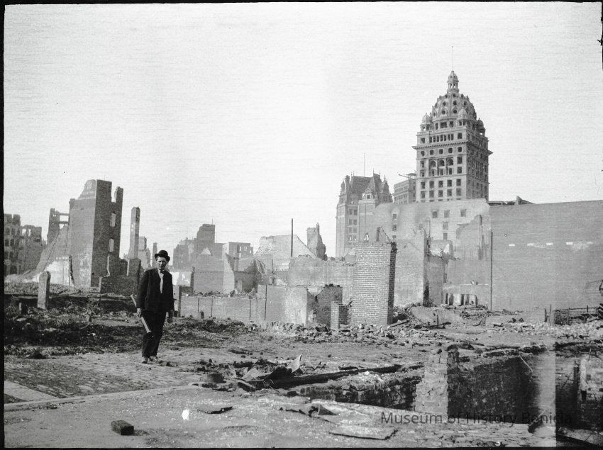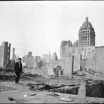 This photo is one of a series of photos of San Francisco after the 1906 earthquake. This photo shows the Call building off to the right and a man in the center carrying a long case. The case looks similar to the one John Molfino is carrying in record 2020.012.0161. This may be a friend of Molfino's who was helping him take photos.Collection