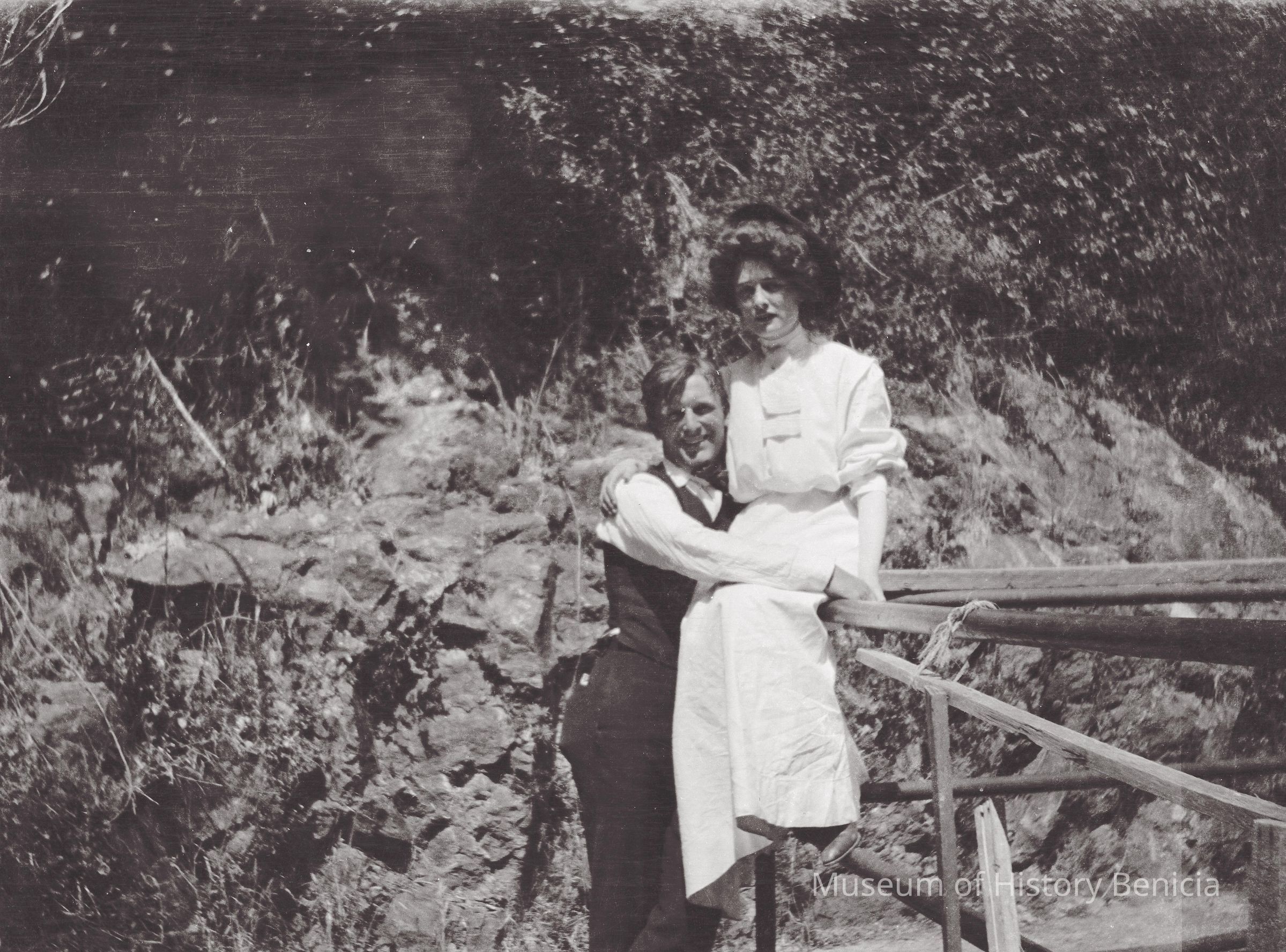 This negative shows a couple with the woman sitting on a railing and the man holding her.