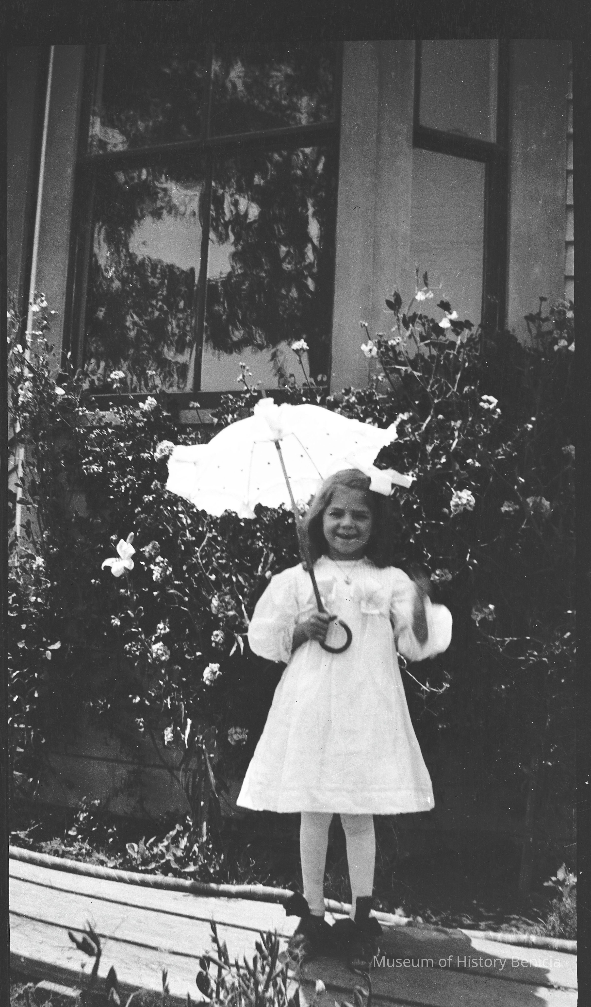 This negative shows John's daughter (Margurite and Violet) by the house with a parasol.