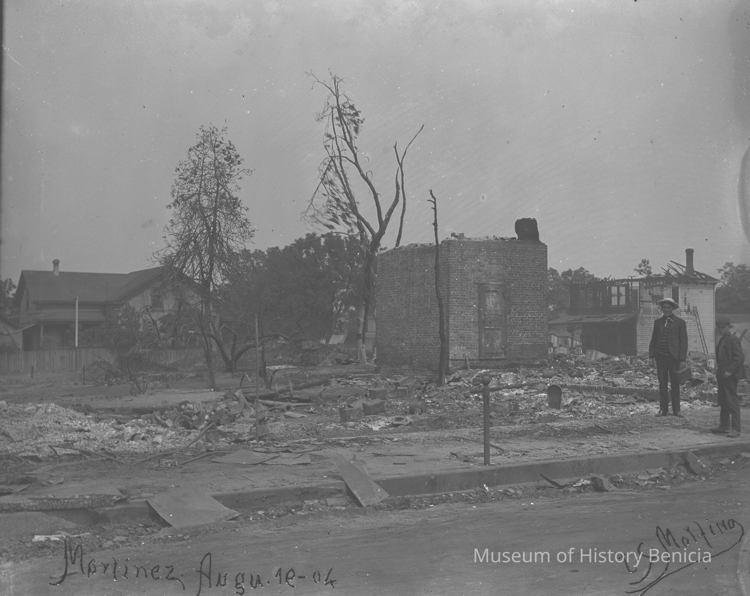 Scene of the Martinez fire in 08/20/1904. The fire damaged two square blocks in downtown Martinez. Benicia sent 100 volunteer firemen across the straits in fishing boats to help battle the fire. The $100,000 blaze started in the box factory and totaly consumed many business. The Benicia volunteers were praised for the aid they rendered and not allowed to return home in damp clothing. Each Benicia fireman received new underclothing, socks, shoes, shirts, overalls, and a cap. -- per Earl BobittCollection