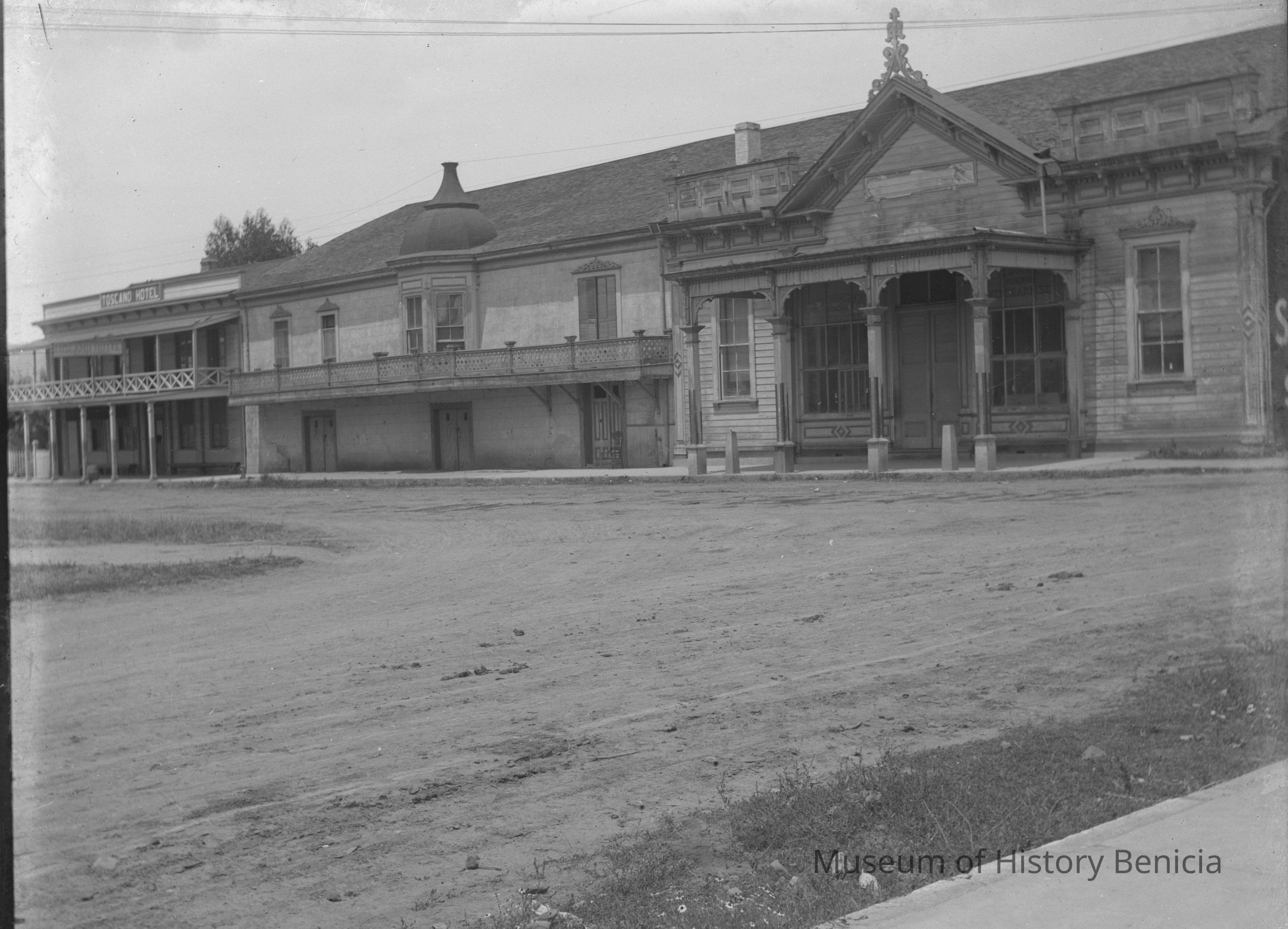 Old buildings, several with balconies. One building says "Toscano Hotel". This is probably the old hotel in Sonoma located on Spain street next to the Barracks.Collection