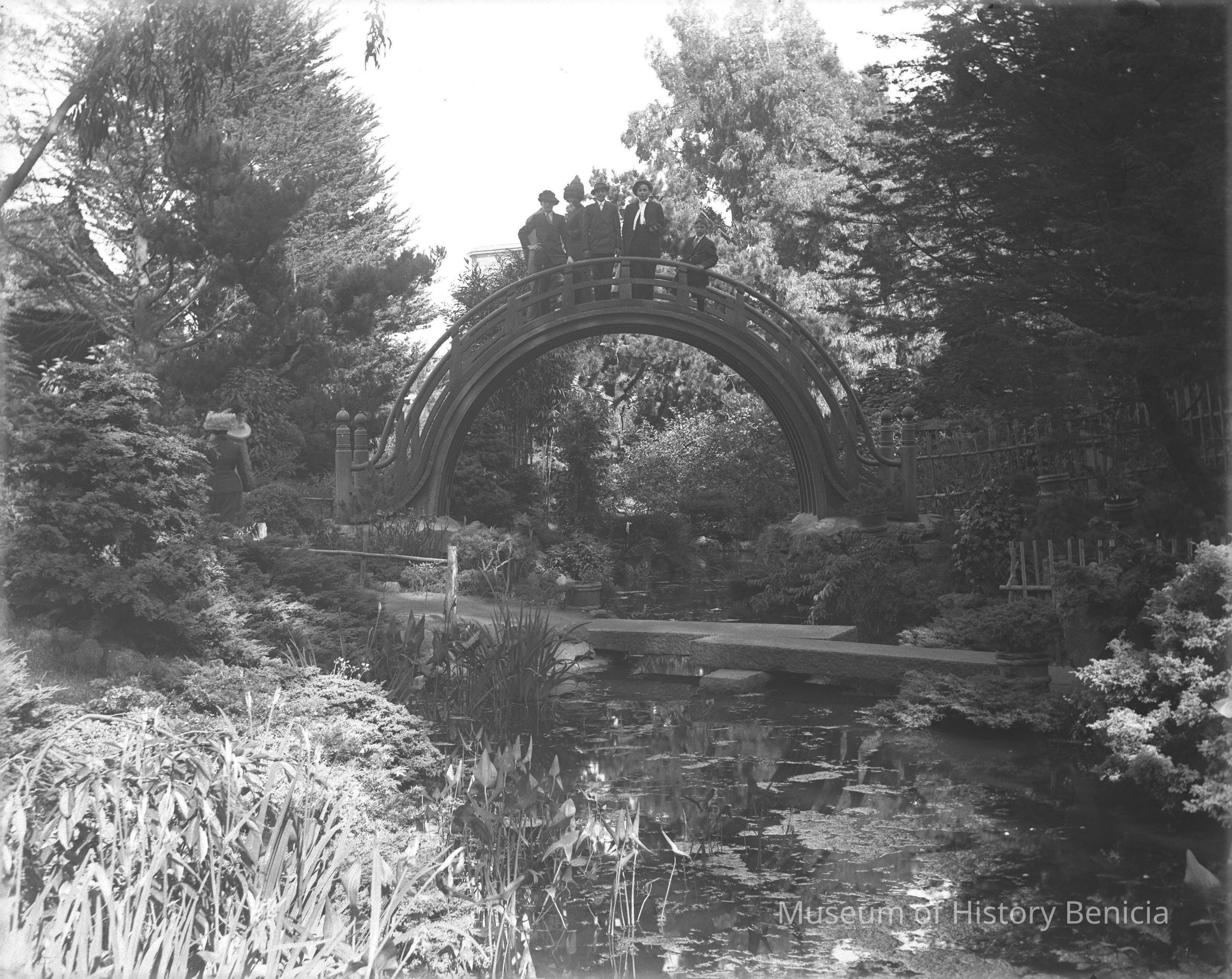 Several people on bridge in Japanese Tea Garden in Golden Gate Park in S.F. One of the women with a big hat looks like "Dita" Molfino (John Molfino's wife).Collection