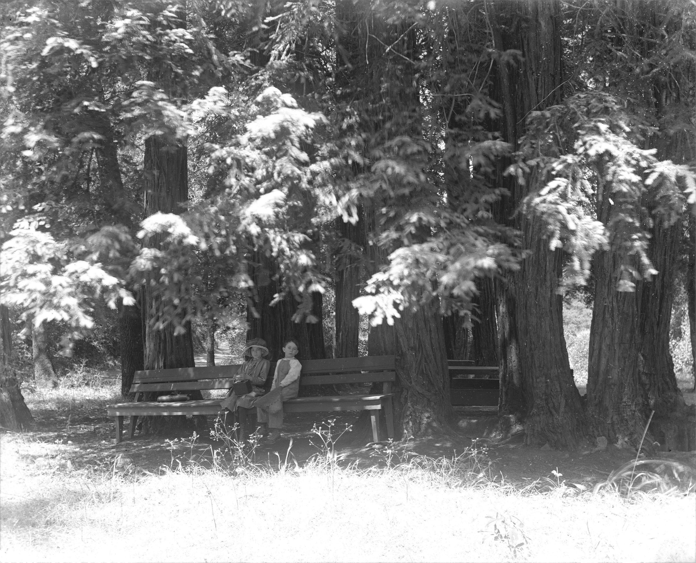 Margarite Molfino and unknown boy on a bench in the woods.