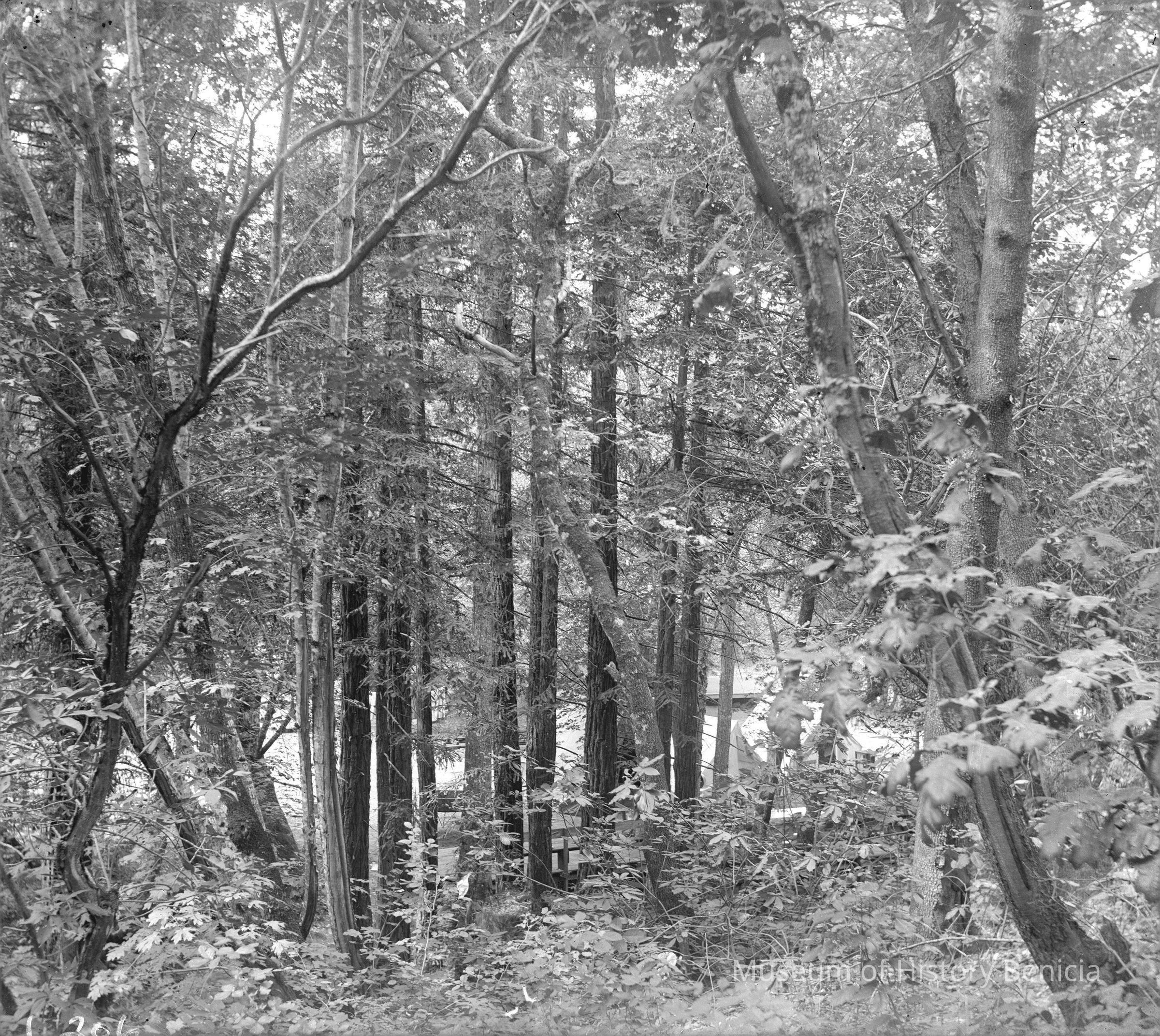 Scene in the woods with tent cabins in background.