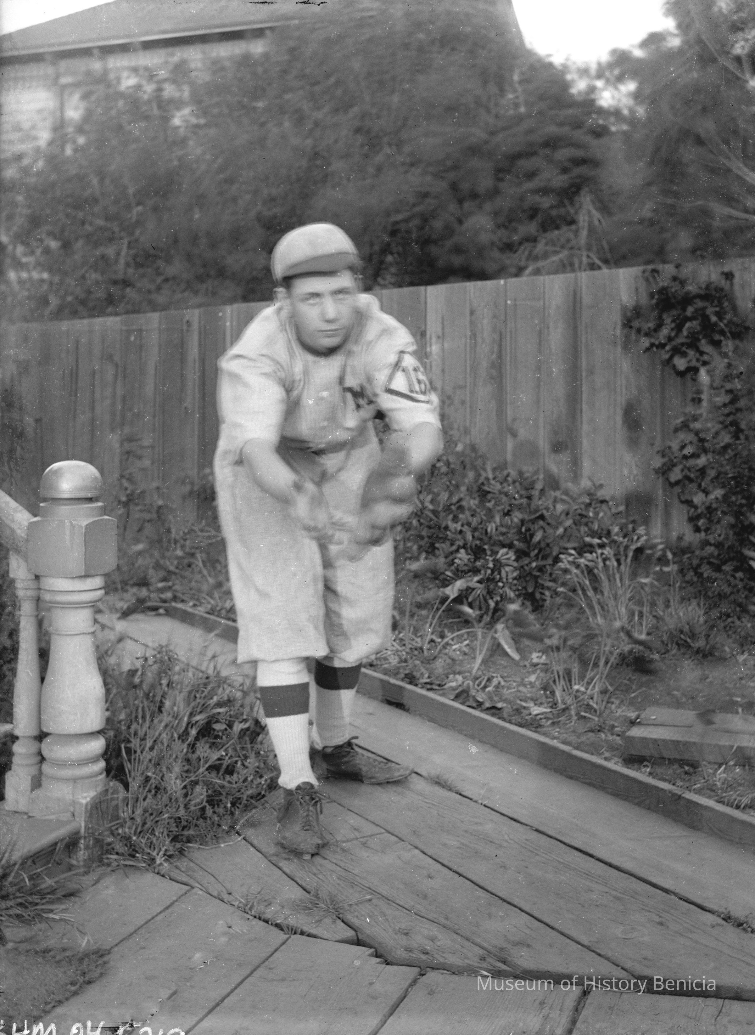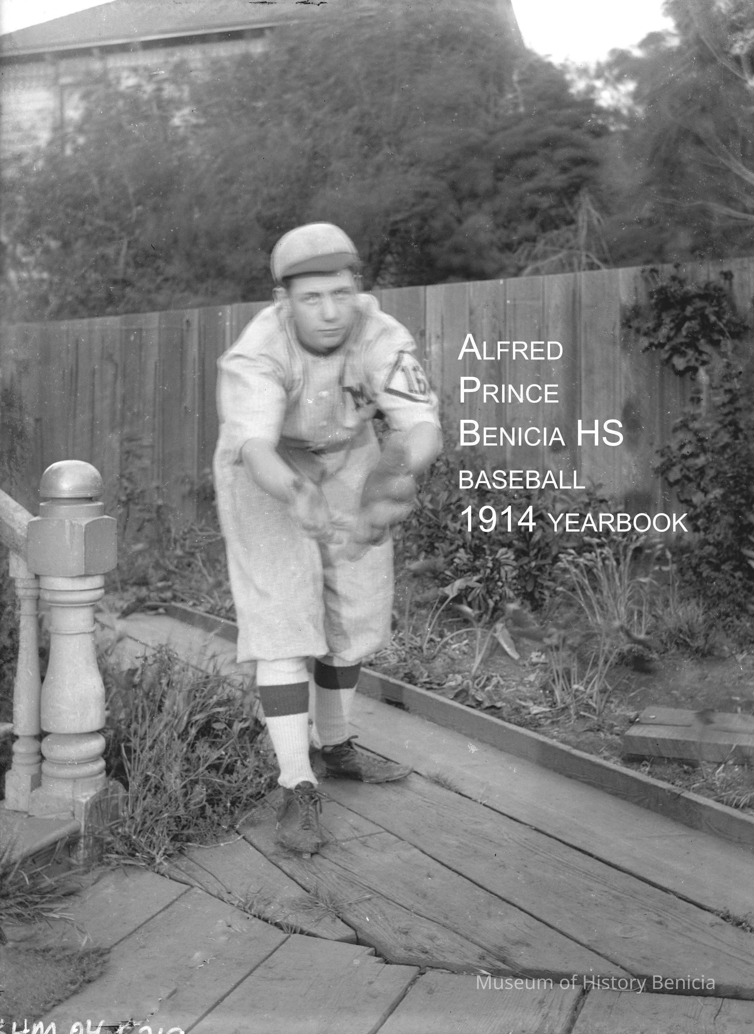 High School baseball player with YMI (Young Men's Institute) uniform. Per the 1914 Benicia High School yearbook this is Alfred Prince. This photo was taken by John Molfino for the yearbook.Collection
