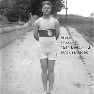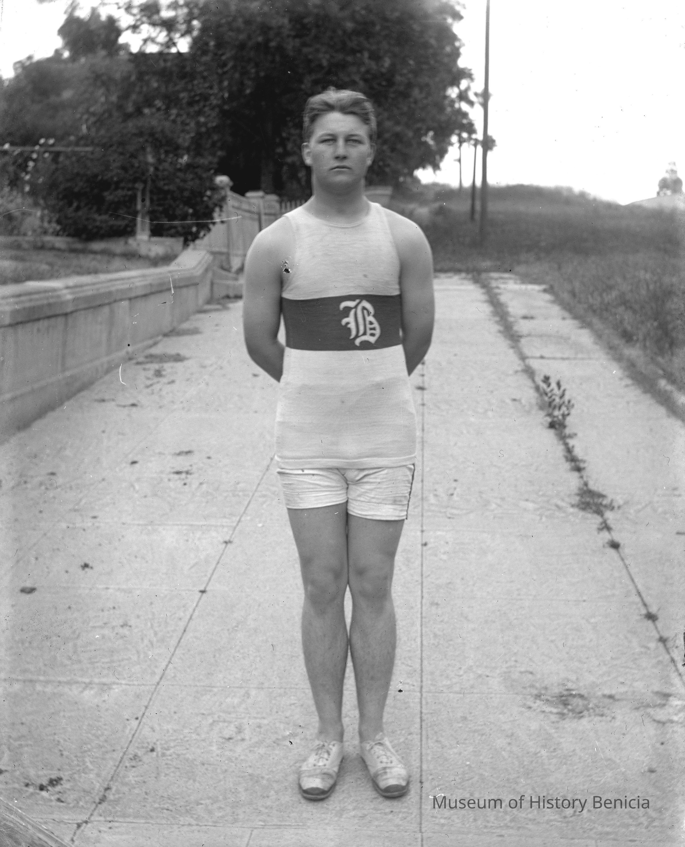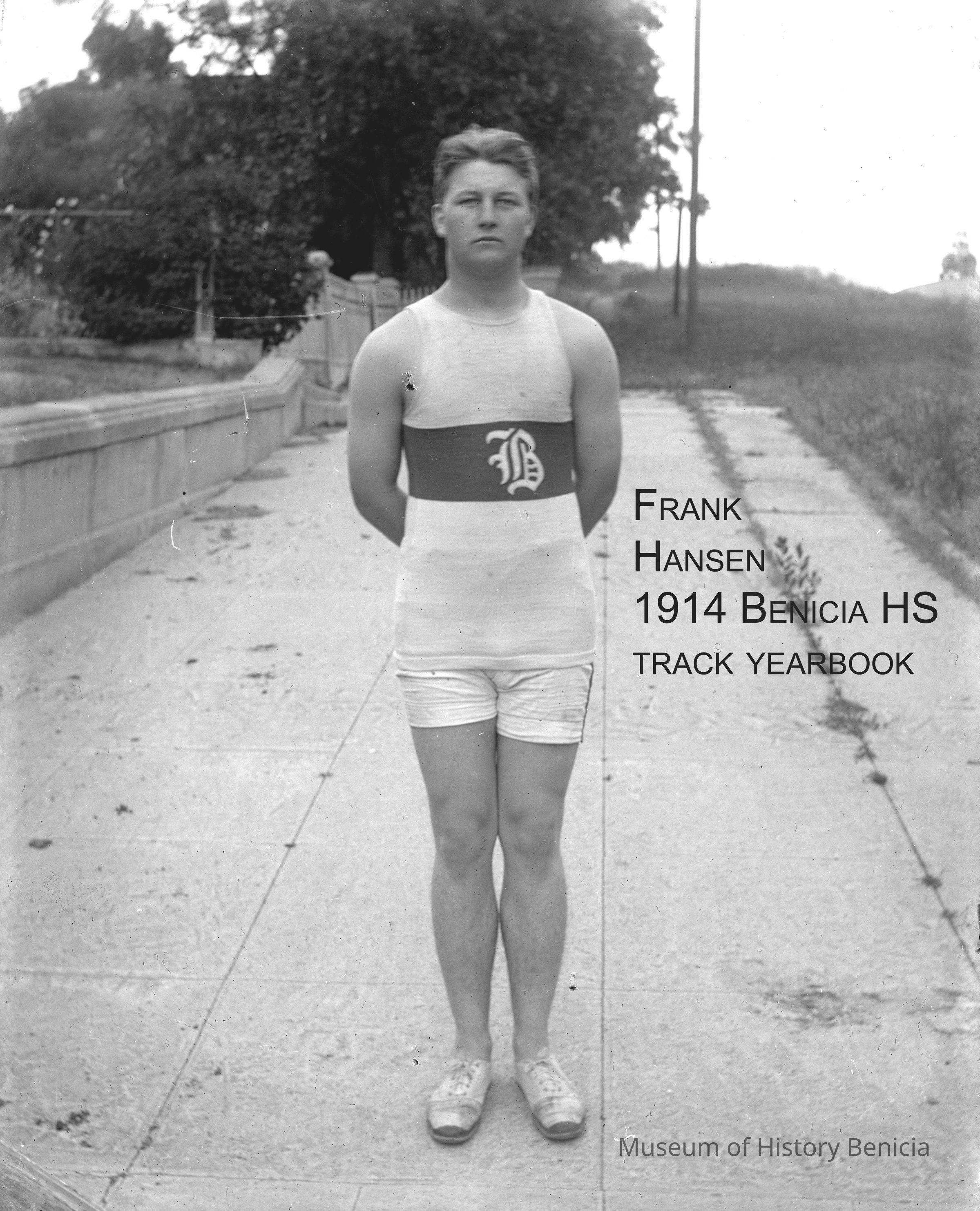 Benicia high school athlete (track) on sidewalk near Hastings Mansion. Per the 1914 Benicia High School yearbook this is Frank Hansen. This photo was taken by John Molfino for the yearbook.Collection