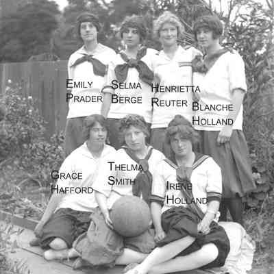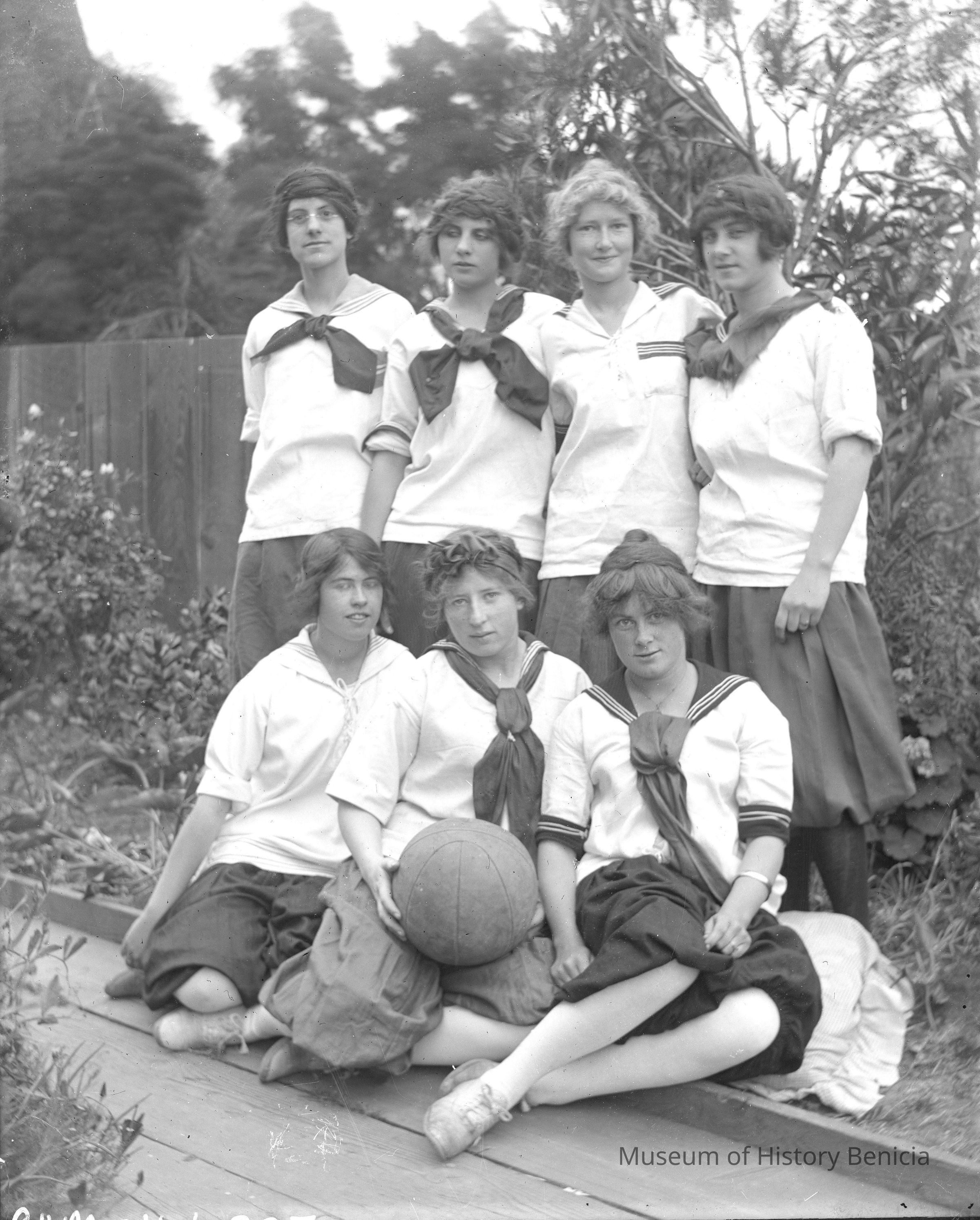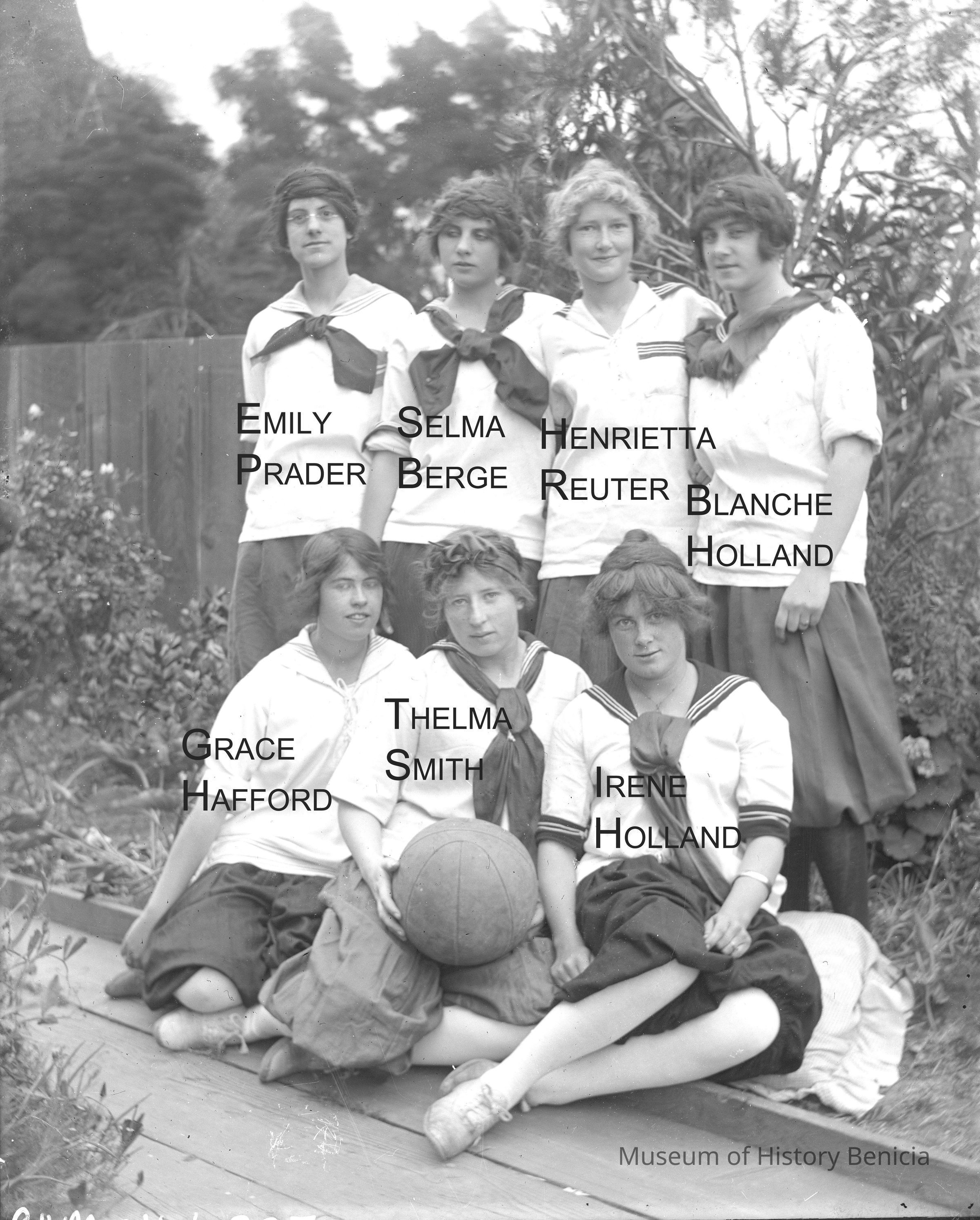 Girls 1914 Benicia High School basketball team. The players are: Thelma Smith, Blanche Holland, Selma Berge, Emily Prader, Henrietta Reuter, Irene Holland, and Grace Hafford. The girls had to practice on an outdoor court but played games on an indoor court. They petitioned the city to use the City Hall for practice but were denied. Because they couldn't practice, they disbanded.Collection