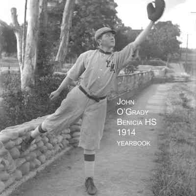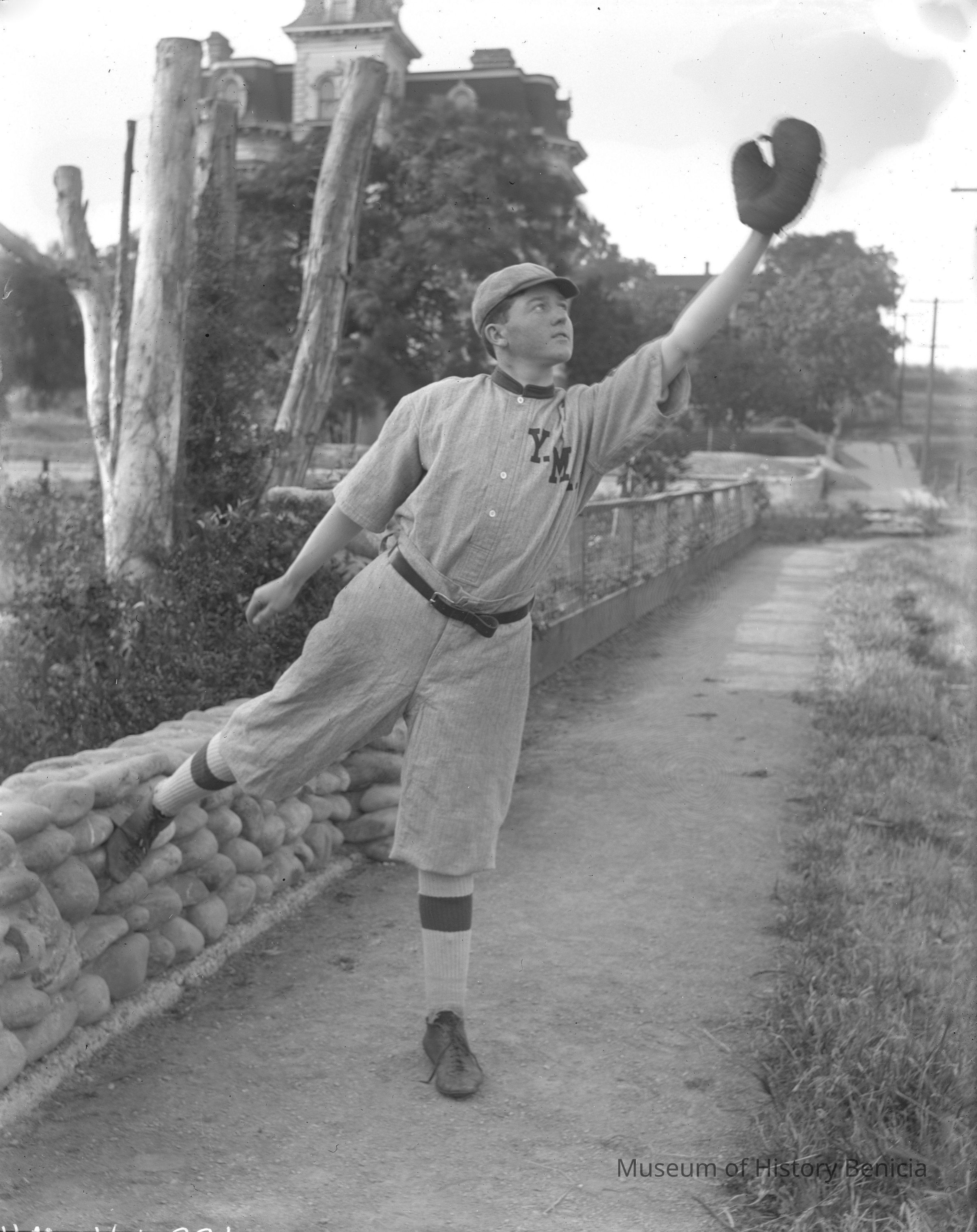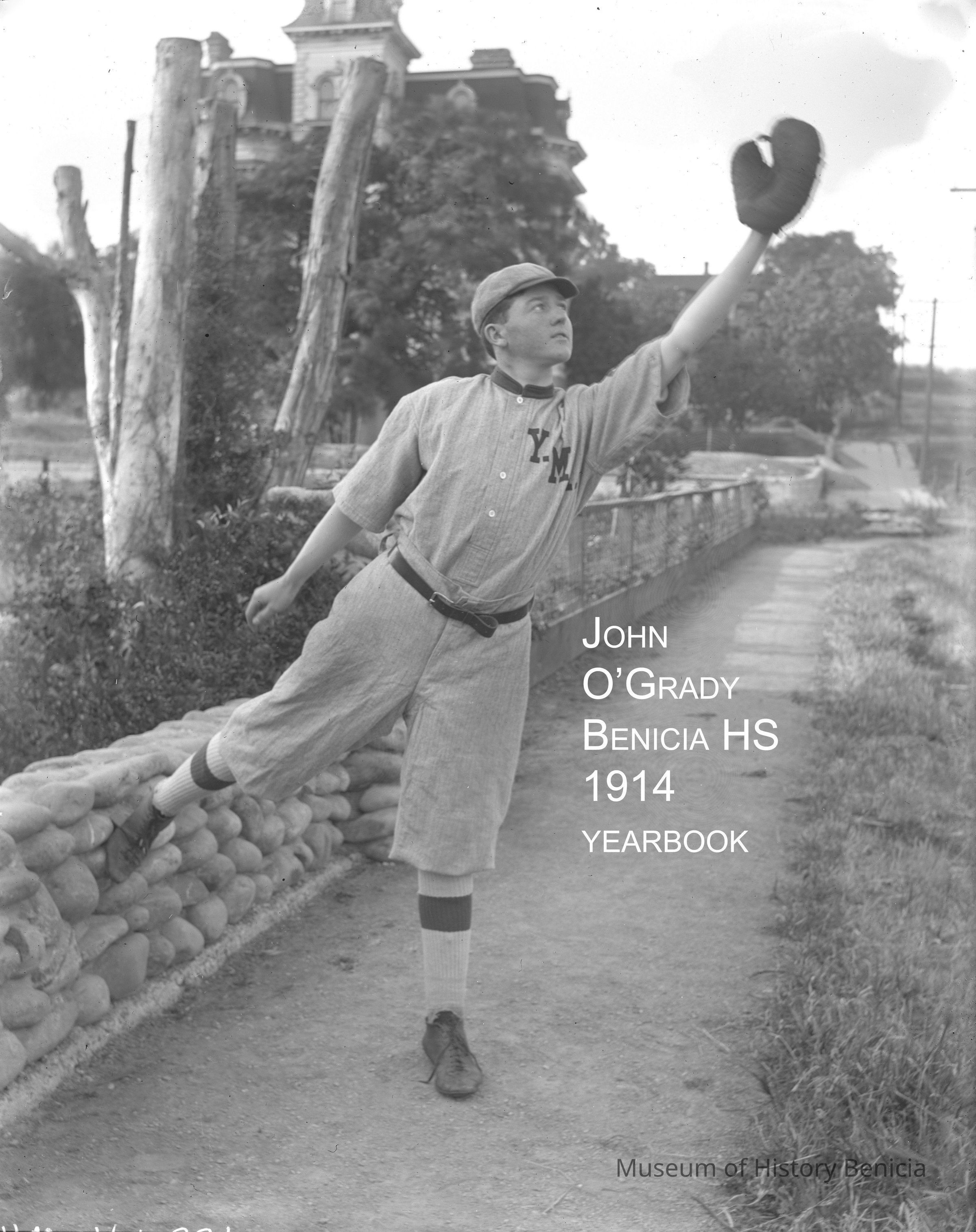 Benicia high school baseball player in front of 1121 West Second street with Hastings mansion in the background and wearing a YMI (Young Mens Institute) uniform. Per the 1914 Benicia High School yearbook this is John O'Grady. This photo was taken by John Molfino for the yearbook.Collection