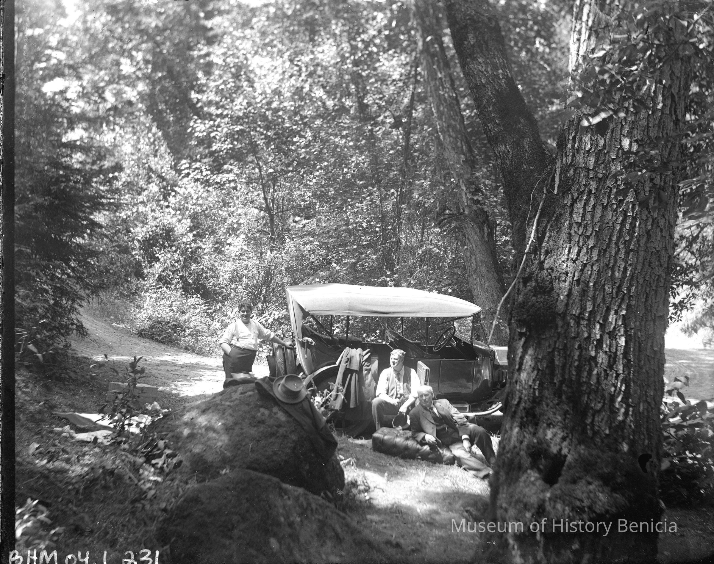 Three men in the woods next to a car. The man laying on the ground is Mayor Crooks.