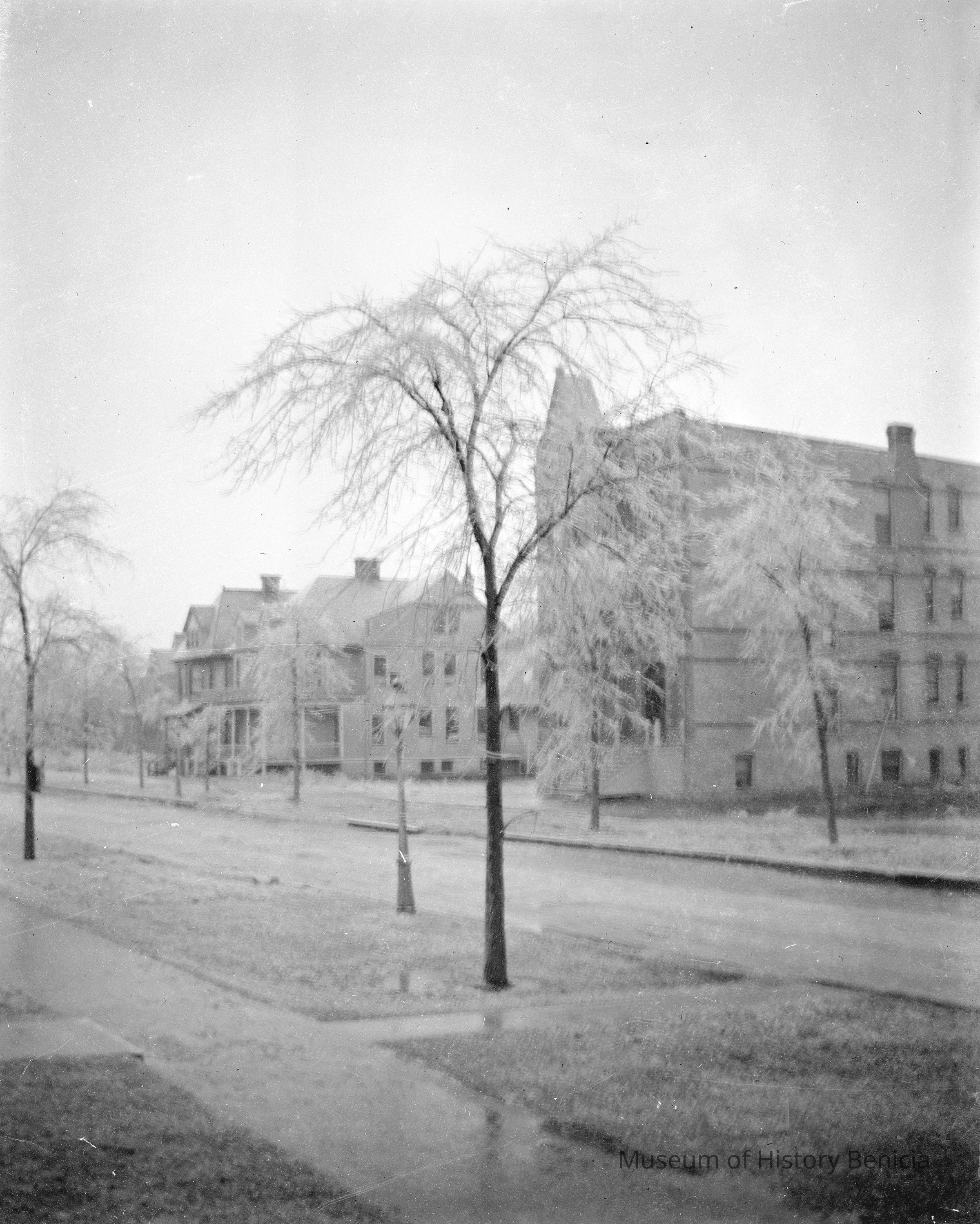 Black and white unidentified street scene; trees in front of buildings. Buildings look like apartments or dormitories. This could be a photo from the Chicago series of glass plate negatives. Not sure.Collection