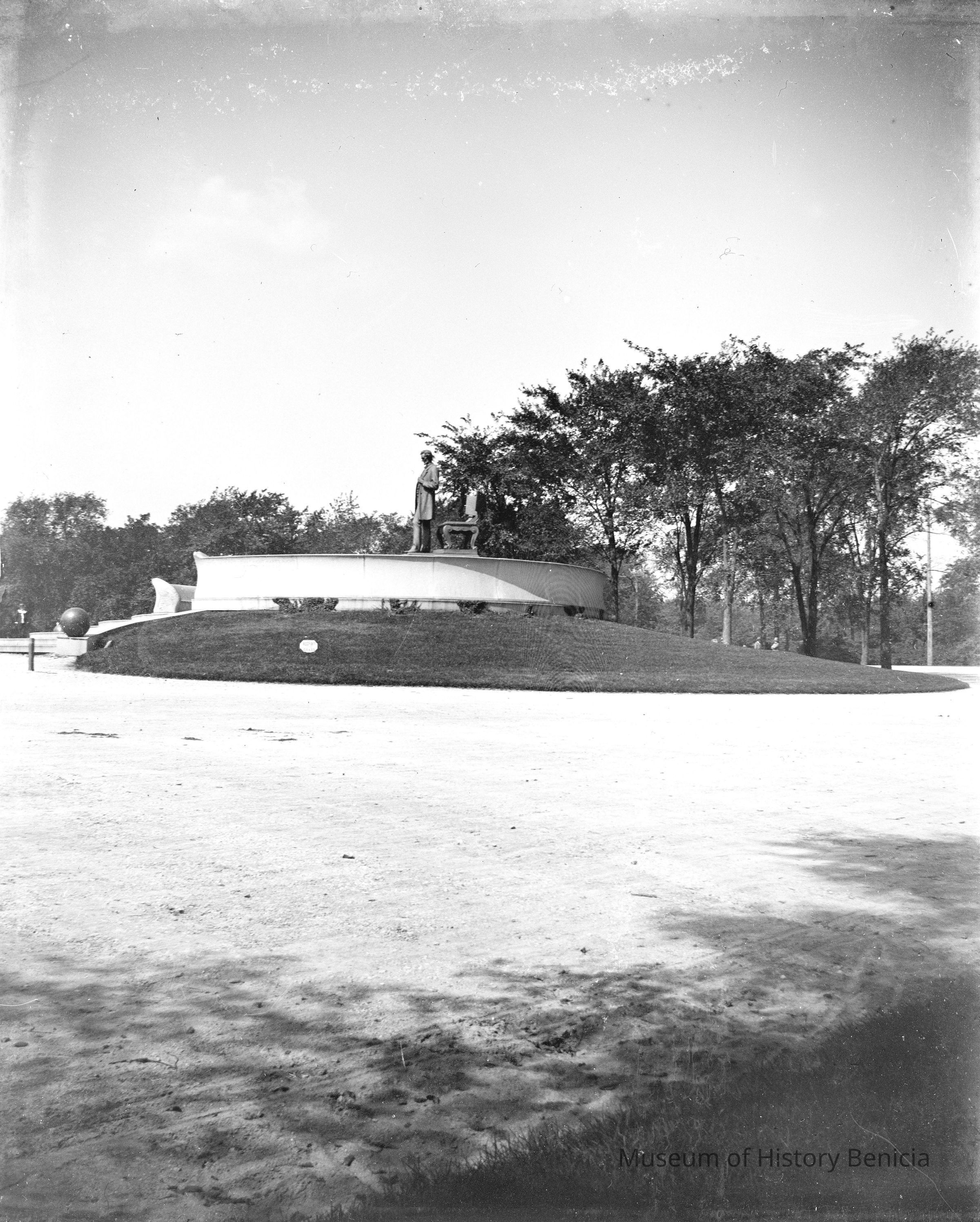 Unidentified monument; standing figure in front of chair. Black and white negative. "Statue of Abe Lincoln in a park. If you're near Lincoln Park in Chicago (Clark Street and North Avenue), take the opportunity to see one of America's most famous Lincoln statues. You will find it on the east lawn of the Chicago Historical Society. A replica of this work by sculptor Augustus Saint-Gaudens also stands outside Westminster Abbey, London. To create this monumental figure Saint-Gaudens used the 1860 life mask of Lincoln by Chicago sculptor Leonard Volk. A Vermont farmer of approximately Lincoln's height served as the model. Thousands of people watched the dedication ceremony on October 22, 1887, when Lincoln's grandson and namesake unveiled the statute and Leonard Swett delivered the address. "Collection