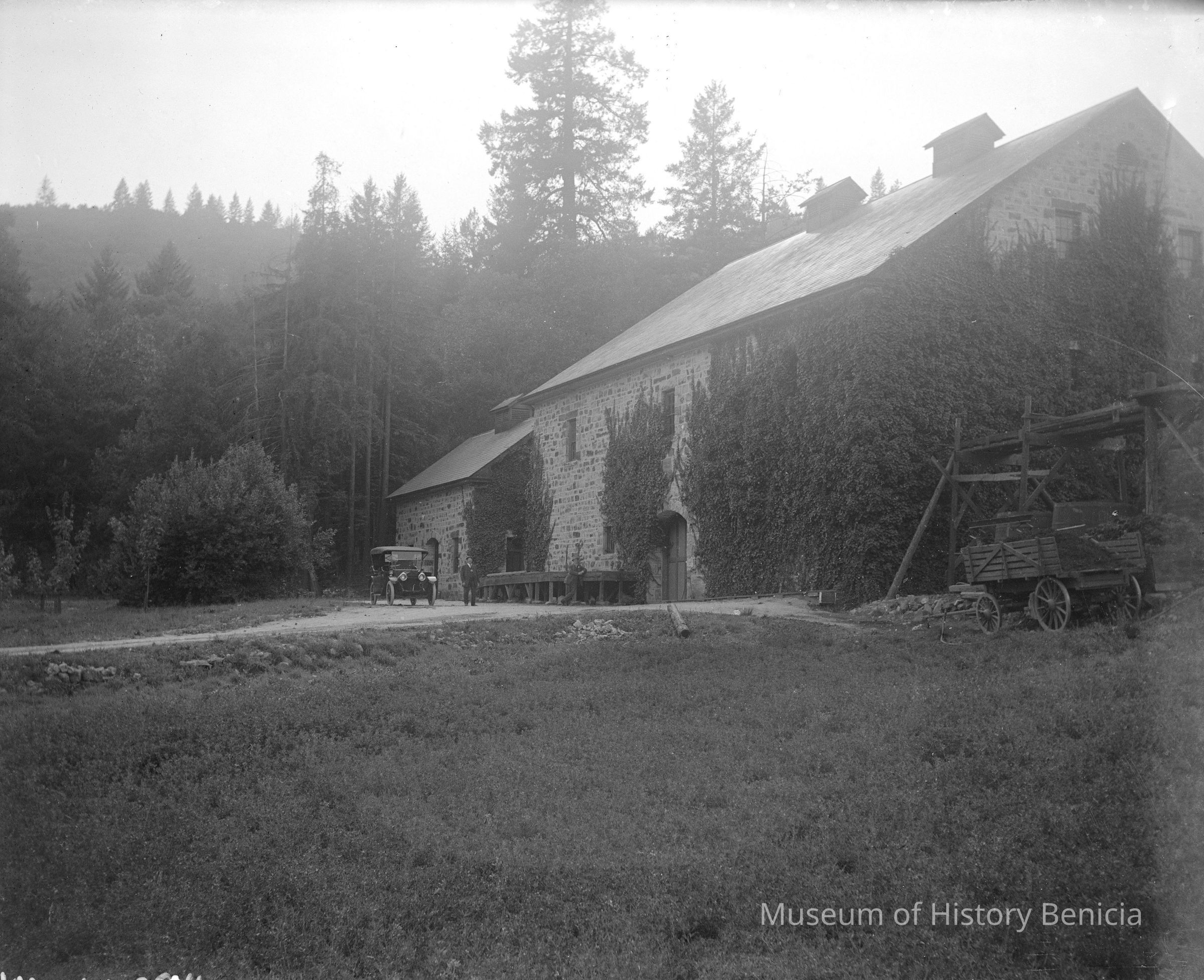 Brick buildings with a car and two men in front. This looks like a winery. There may be a wagon of grapes to the right of the building.Collection