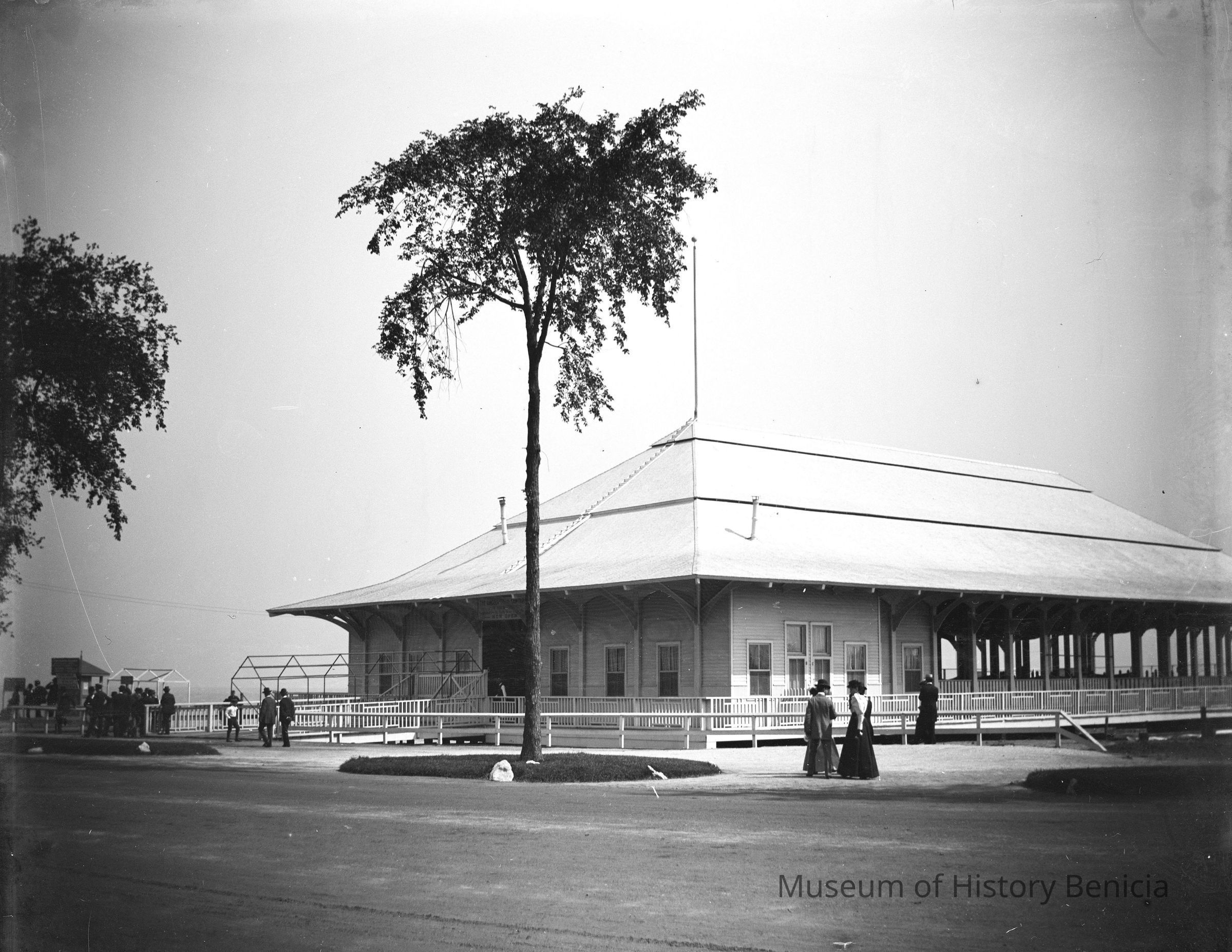 Railroad station[?] at unidentified location. Black and white. Building with people walking around. Sign over building says "Lincoln ? Now Open". probably a boat dock or outdoor terminal on the lake in Chicago. Sign may refer to something at Lincoln Park, Chicago, Il.Collection