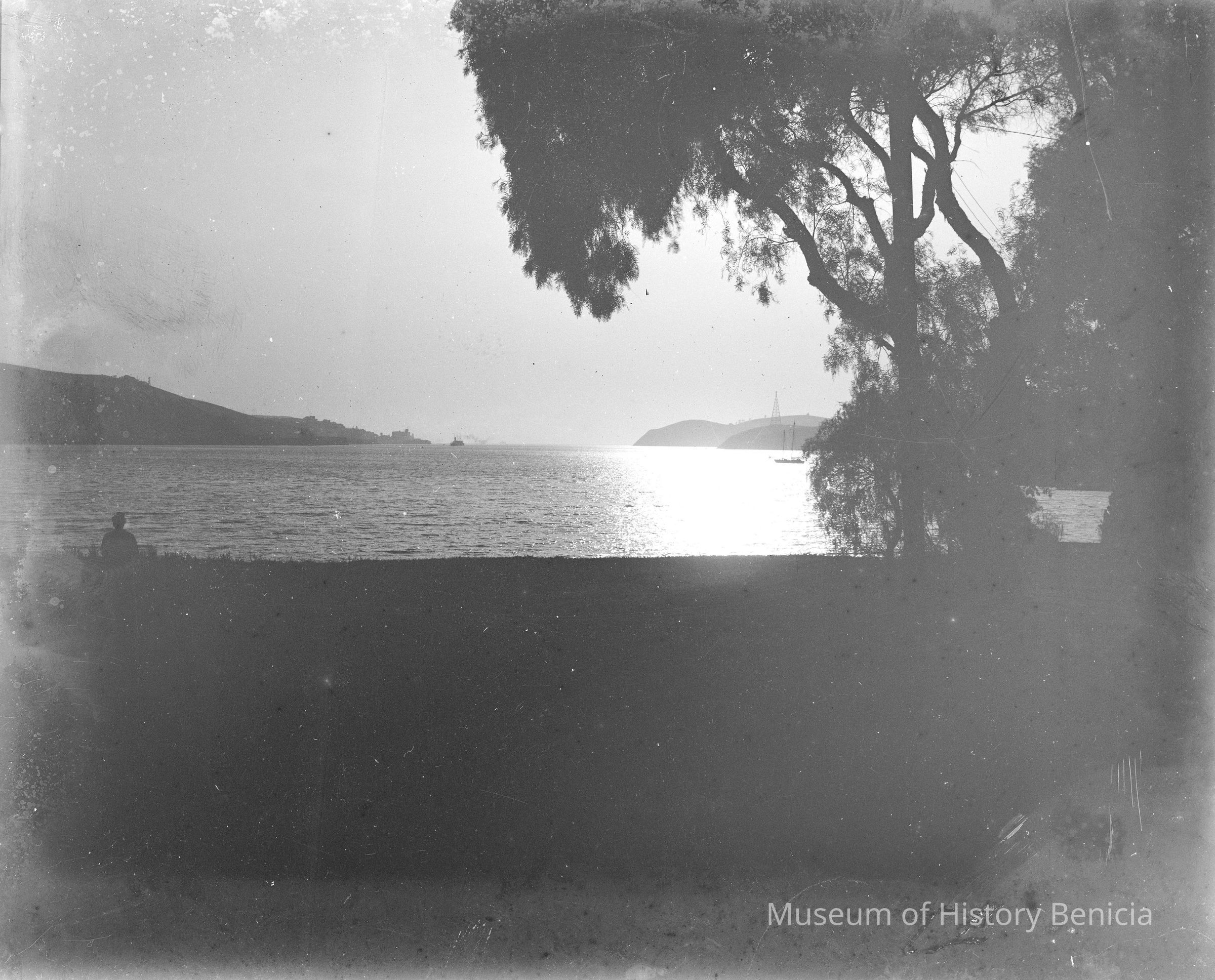 View down the Carquinez Straits at sunset. Man in a chair silhouetted in distance.