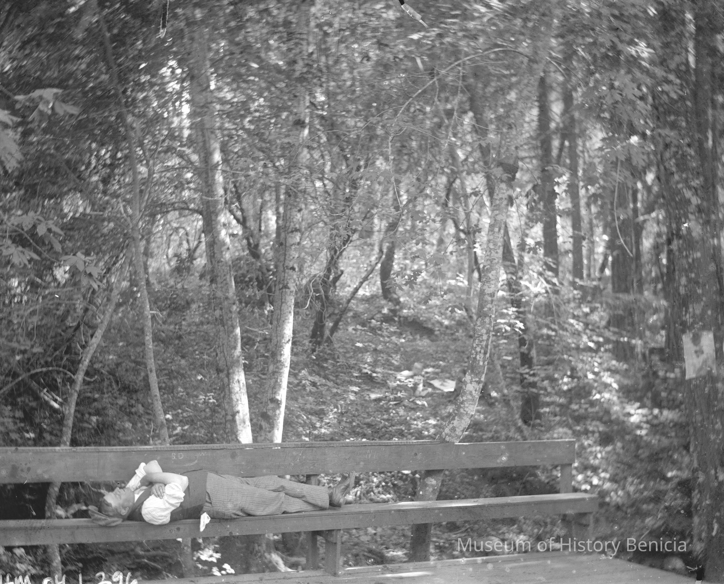 Man laying on bench in woods.