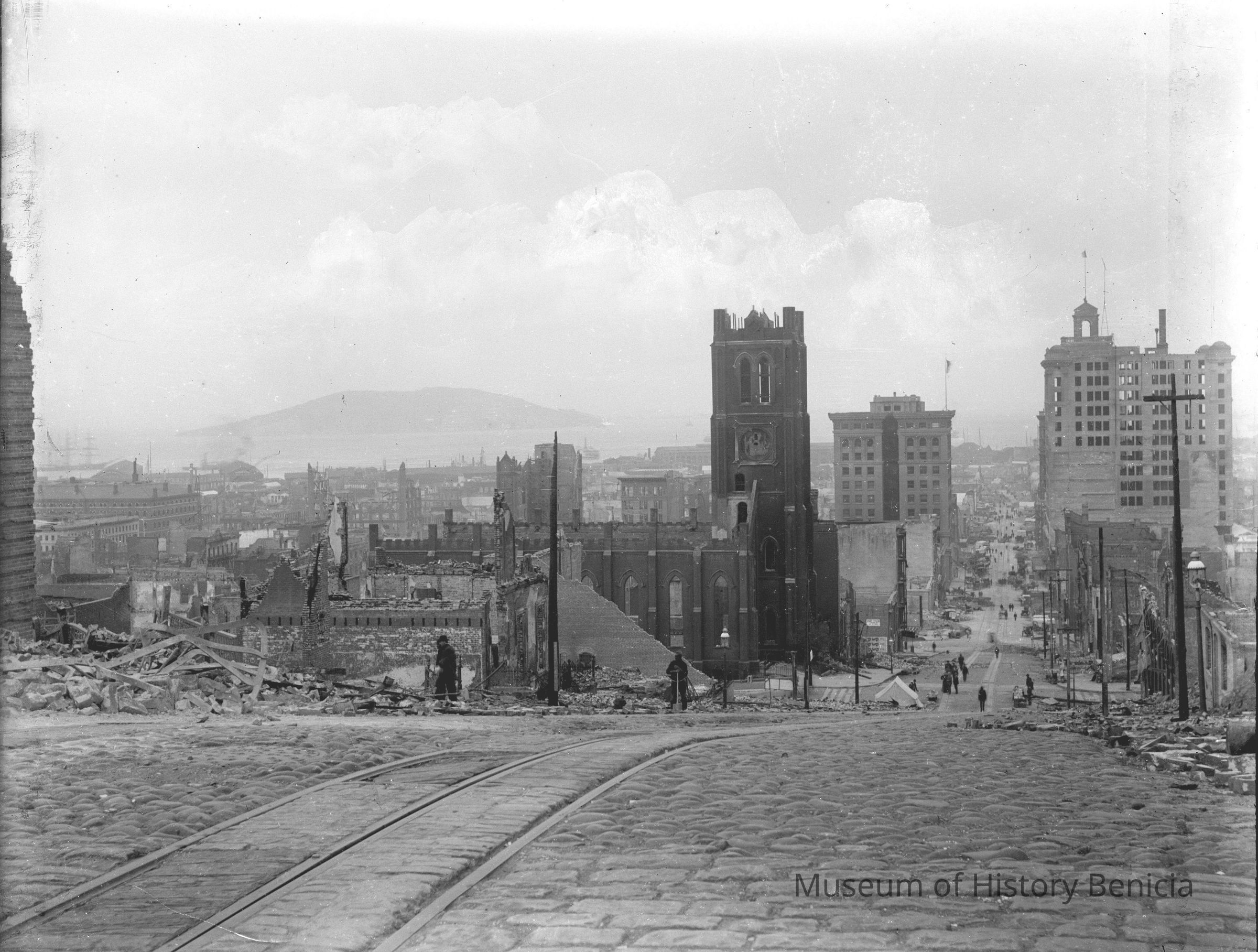 San Francisco 1906, after the earthquake. View is looking down (East) California St. with Old St. Mary's to the left side (the only standing building) with the destruction of the city below. The other standing building on the left is the Kohl bldg.Collection