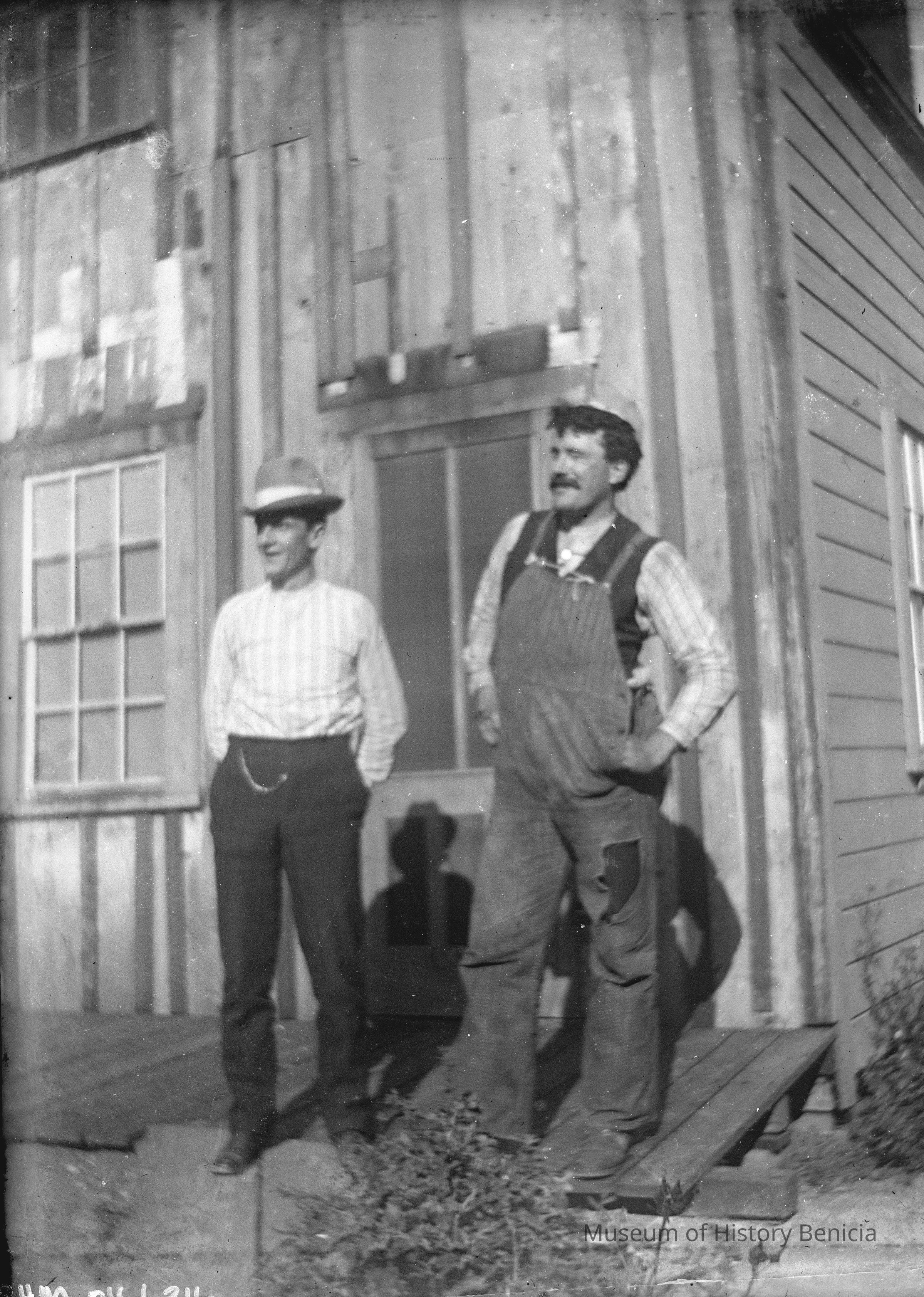 Two men one in coveralls in front of an old wooden building.